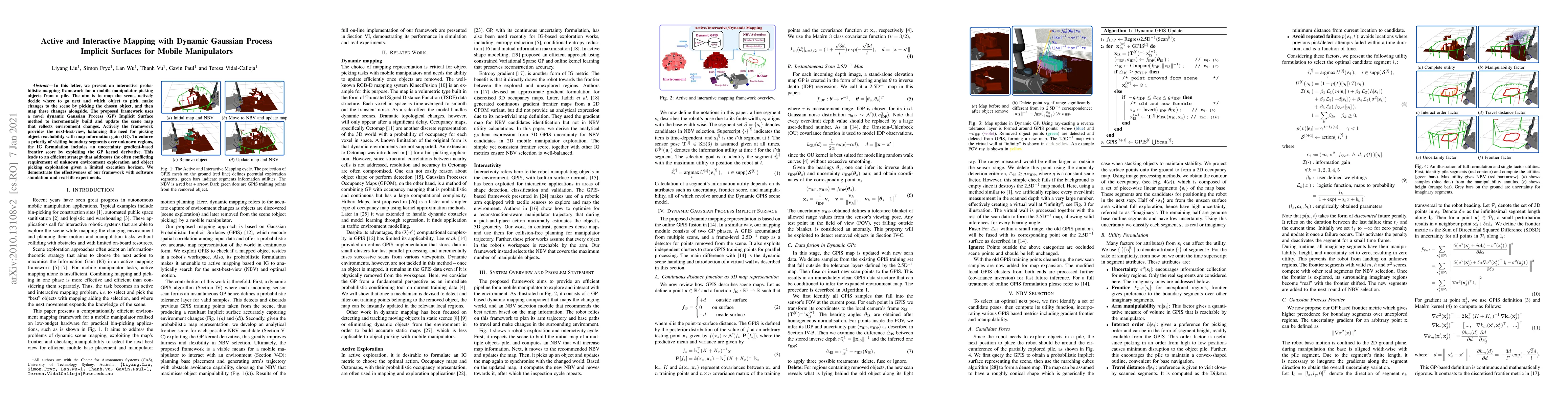 In this letter, we present an interactive probabilistic mapping framework for a mobile manipulator picking objects from a pile. The aim is to map the scene, actively decide where to go next and which object to pick, make changes to the scene by picking the chosen object, and then map these changes alongside. The proposed framework uses a novel dynamic Gaussian Process (GP) Implicit Surface method to incrementally build and update the scene map that reflects environment changes. Actively the framework provides the next-best-view, balancing the need for picking object reachability with map information gain (IG). To enforce a priority of visiting boundary segments over unknown regions, the IG formulation includes an uncertainty gradient-based frontier score by exploiting the GP kernel derivative. This leads to an efficient strategy that addresses the often conflicting requirement of unknown environment exploration and object picking exploitation given a limited execution horizon. We demonstrate the effectiveness of our framework with software simulation and real-life experiments.