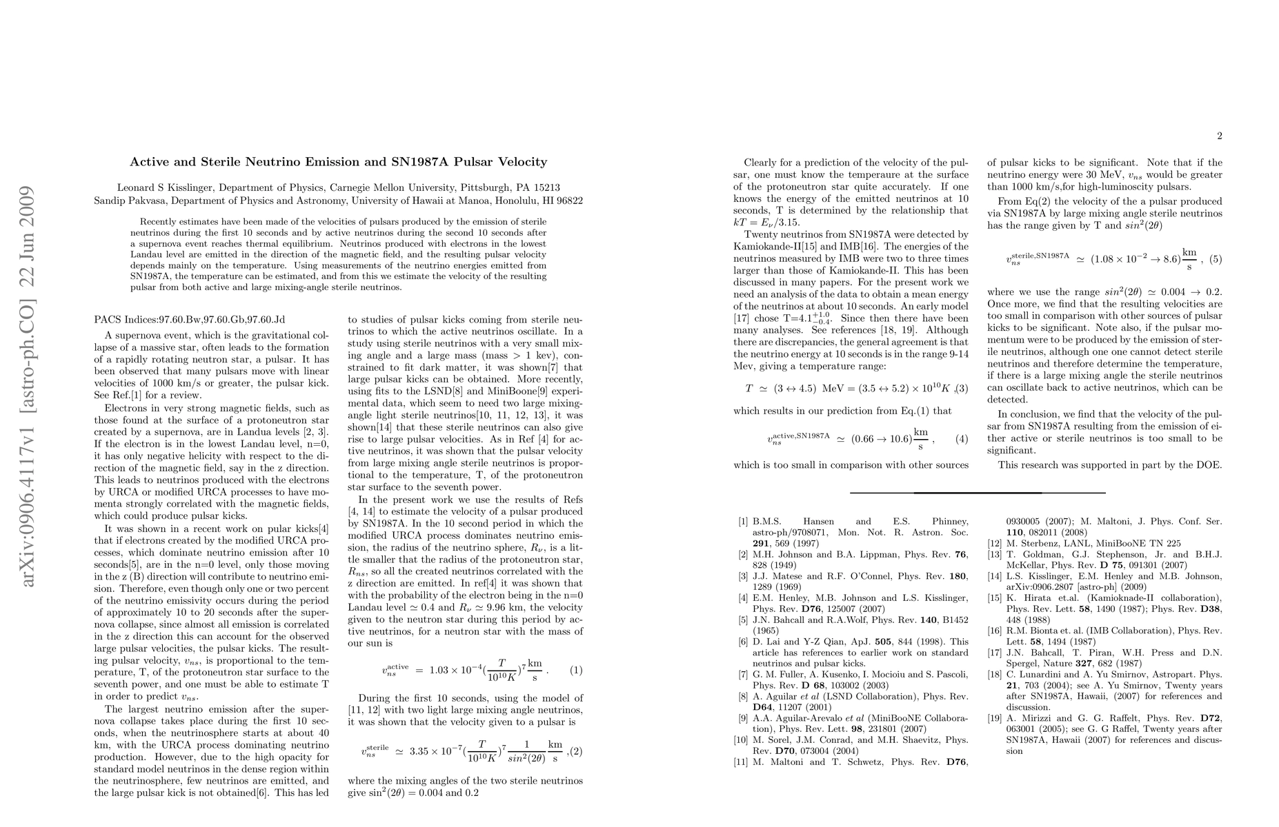 Recently estimates have been made of the velocities of pulsars produced by the emission of sterile neutrinos during the first 10 seconds and by active neutrinos during the second 10 seconds after a supernova event reaches thermal equilibrium. Neutrinos produced with electrons in the lowest Landau level are emitted in the direction of the magnetic field, and the resulting pulsar velocity depends mainly on the temperature. Using measurements of the neutrino energies emitted from SN1987A, the temperature can be estimated, and from this we estimate the velocity of the resulting pulsar from both active and large mixing-angle sterile neutrinos.