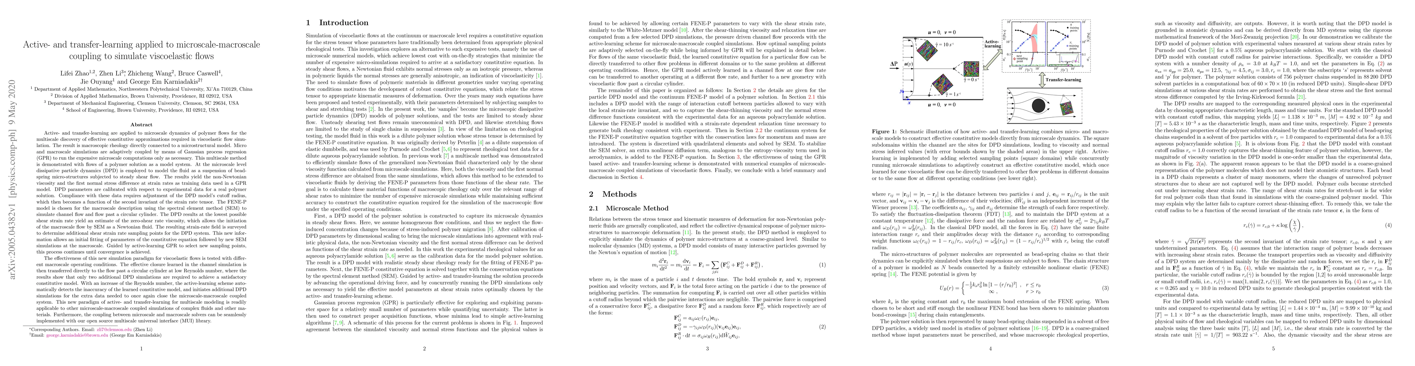 This paper applies active- and transfer-learning to polymer flows to develop effective constitutive approximations for viscoelastic flow simulations, coupling microscale and macroscale models adaptively. The method uses Gaussian process regression to optimize microscale computations and demonstrates superior performance over empirical models.
