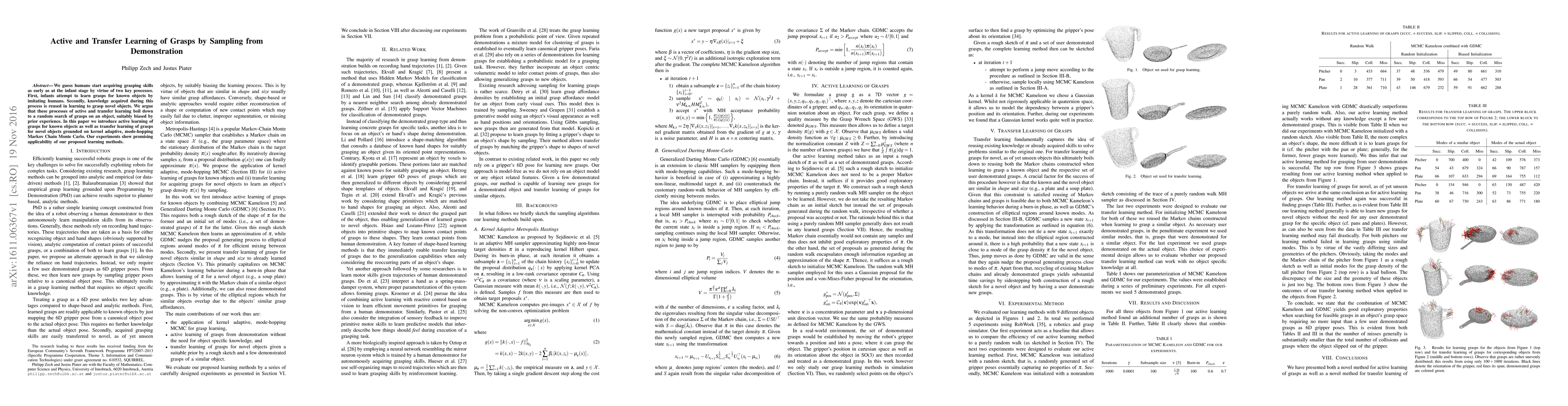 This paper proposes active and transfer learning methods for grasp acquisition, inspired by human infant learning. It introduces kernel adaptive, mode-hopping Markov Chain Monte Carlo for learning grasps of known objects and transferring this knowledge to novel objects. Experiments demonstrate the effectiveness of these methods.