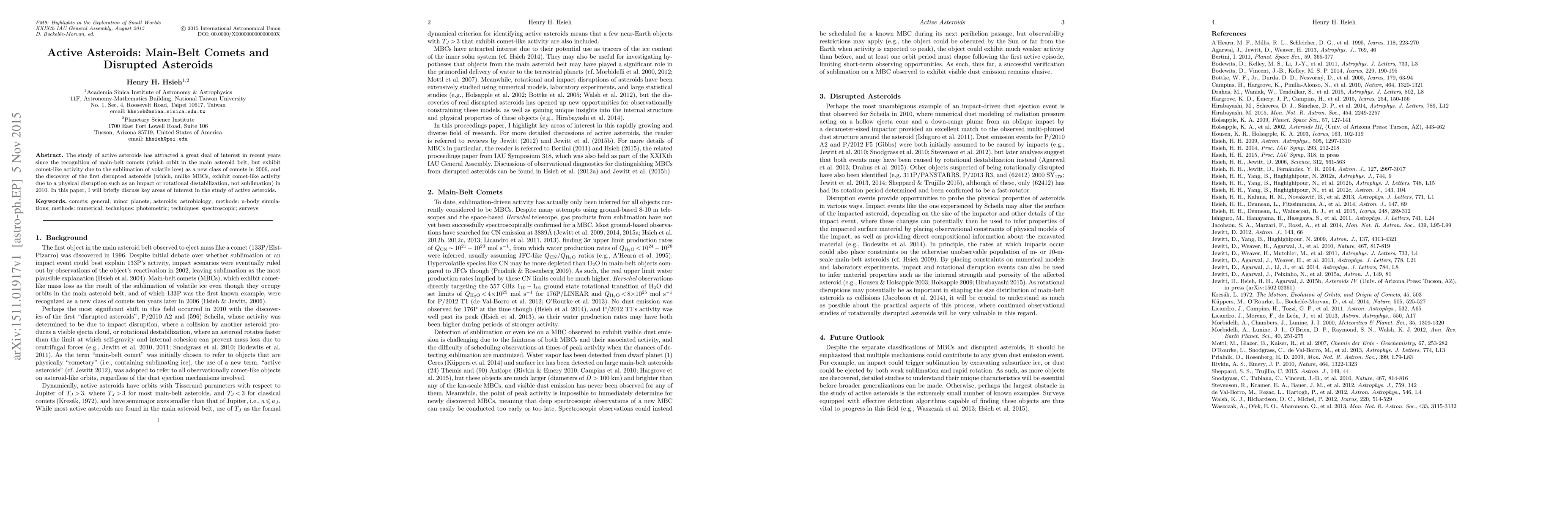 This paper explores the emerging field of active asteroids, focusing on main-belt comets and disrupted asteroids, which exhibit comet-like activity due to sublimation of ices or physical disruptions, respectively. It highlights key areas of interest in this growing research domain.