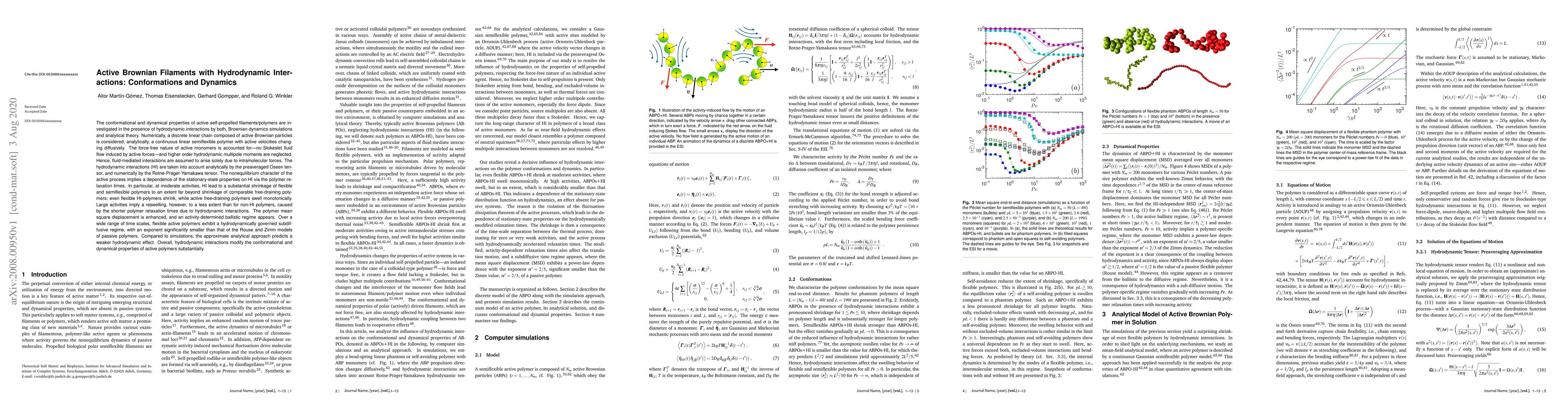 This paper investigates the conformational and dynamical properties of active self-propelled filaments in the presence of hydrodynamic interactions, using both simulations and analytical theory. It finds that hydrodynamic interactions cause substantial shrinkage of flexible and semiflexible polymers, leading to enhanced mean square displacement and a ballistic regime, while analytical predictions show weaker effects compared to simulations.