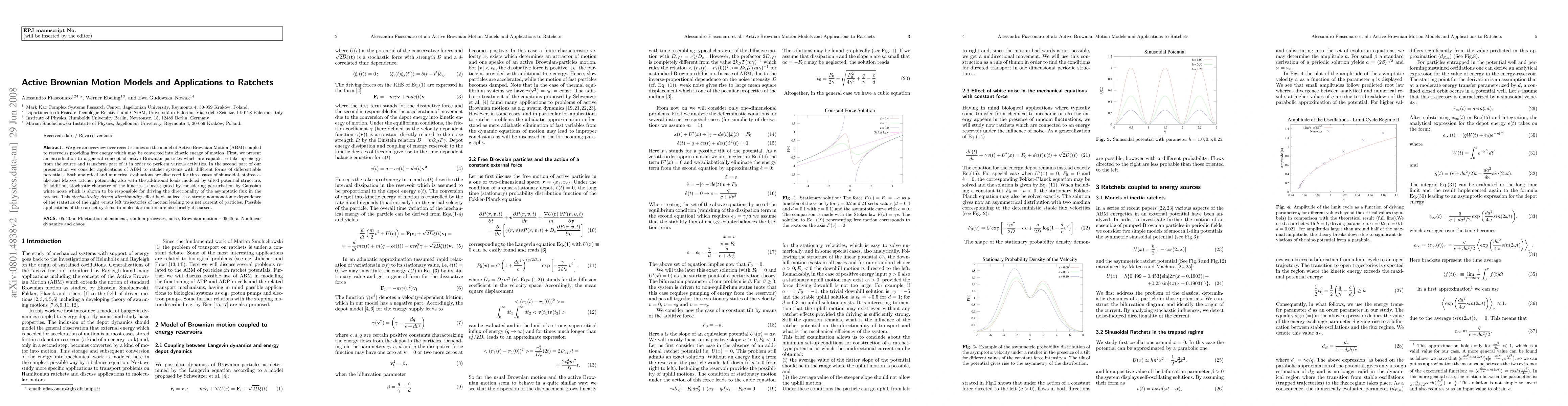 We give an overview over recent studies on the model of Active Brownian Motion (ABM) coupled to reservoirs providing free energy which may be converted into kinetic energy of motion. First, we present an introduction to a general concept of active Brownian particles which are capable to take up energy from the source and transform part of it in order to perform various activities. In the second part of our presentation we consider applications of ABM to ratchet systems with different forms of differentiable potentials. Both analytical and numerical evaluations are discussed for three cases of sinusoidal, staircase-like and Mateos ratchet potentials, also with the additional loads modeled by tilted potential structure. In addition, stochastic character of the kinetics is investigated by considering perturbation by Gaussian white noise which is shown to be responsible for driving the directionality of the asymptotic flux in the ratchet. This \textit{stochastically driven directionality} effect is visualized as a strong nonmonotonic dependence of the statistics of the right versus left trajectories of motion leading to a net current of particles. Possible applications of the ratchet systems to molecular motors are also briefly discussed