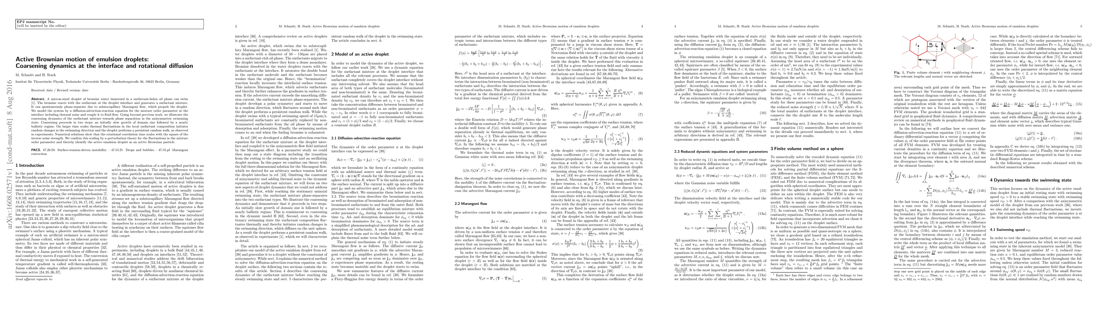 A micron-sized droplet of bromine water immersed in a surfactant-laden oil phase can swim (S. Thutupalli, R. Seemann, S. Herminghaus, New J. Phys. 13 073021 (2011)). The bromine reacts with the surfactant at the droplet interface and generates a surfactant mixture. It can spontaneously phase-separate due to solutocapillary Marangoni flow, which propels the droplet. We model the system by a diffusion-advection-reaction equation for the mixture order parameter at the interface including thermal noise and couple it to fluid flow. Going beyond previous work, we illustrate the coarsening dynamics of the surfactant mixture towards phase separation in the axisymmetric swimming state. Coarsening proceeds in two steps: an initially slow growth of domain size followed by a nearly ballistic regime. On larger time scales thermal fluctuations in the local surfactant composition initiates random changes in the swimming direction and the droplet performs a persistent random walk, as observed in experiments. Numerical solutions show that the rotational correlation time scales with the square of the inverse noise strength. We confirm this scaling by a perturbation theory for the fluctuations in the mixture order parameter and thereby identify the active emulsion droplet as an active Brownian particle.
