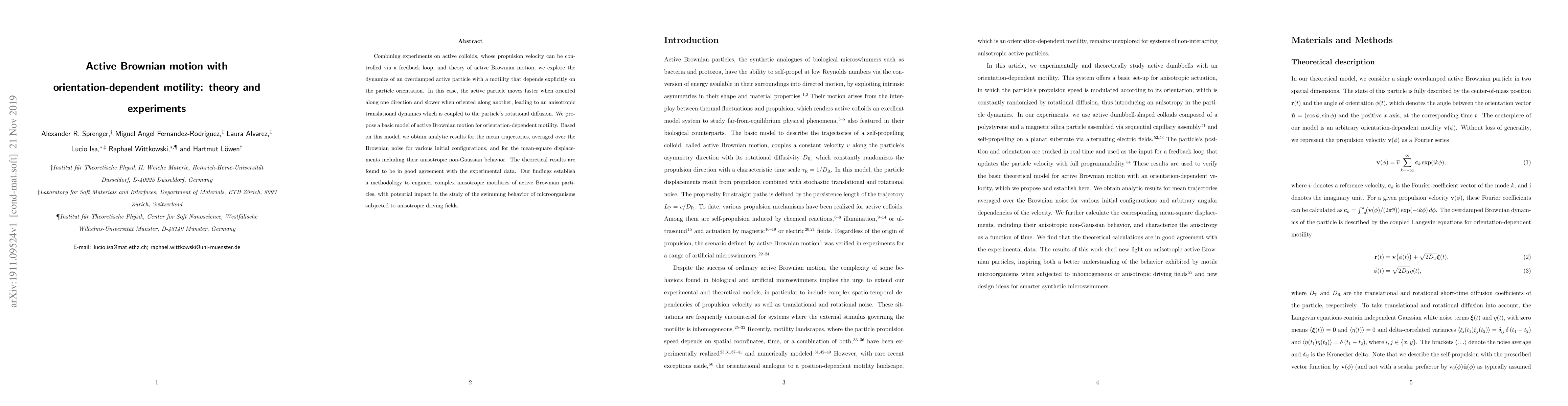 This paper combines theoretical modeling and experimental studies to investigate active Brownian particles with orientation-dependent motility. The model predicts anisotropic translational dynamics and rotational diffusion, with theoretical results matching experimental data on active colloids.