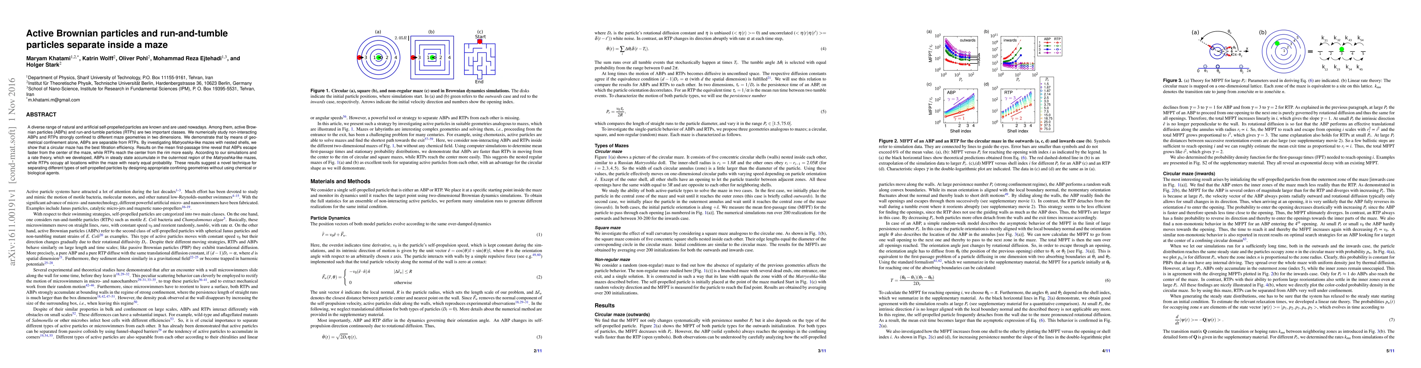 This study demonstrates that active Brownian particles (ABPs) and run-and-tumble particles (RTPs) can be separated using geometrical confinement in mazes. Simulations show that ABPs escape faster from maze centers while RTPs reach the center more easily, indicating that maze design can effectively segregate these particle types without chemical or biological intervention.