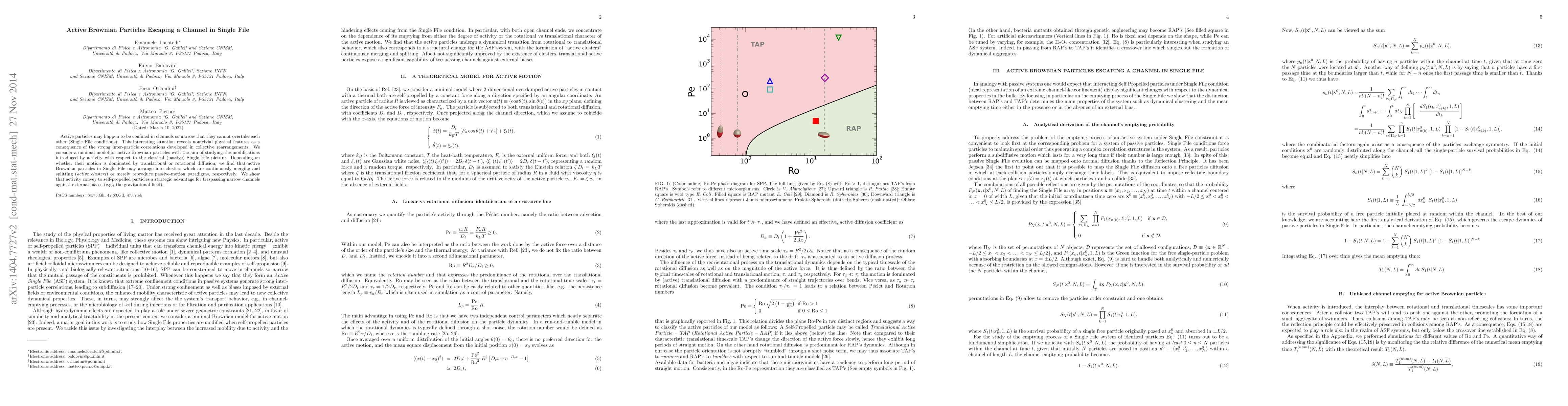 This paper investigates how active Brownian particles behave in narrow channels where they must move in single file, revealing that active particles can either form dynamic clusters or follow passive motion patterns depending on their dominant diffusion type. Active particles show an advantage in escaping channels against external forces due to their self-propulsion.