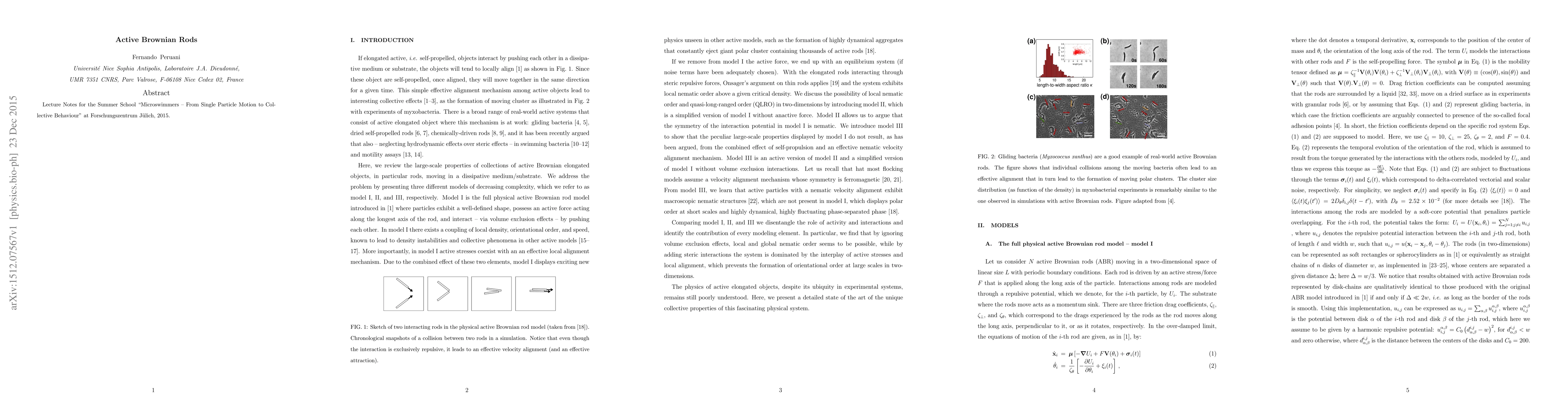 Here, I review the large-scale properties of collections of active Brownian elongated objects, in particular rods, moving in a dissipative medium/substrate. I address the problem by presenting three different models of decreasing complexity, which I refer to as model I, II, and III, respectively.