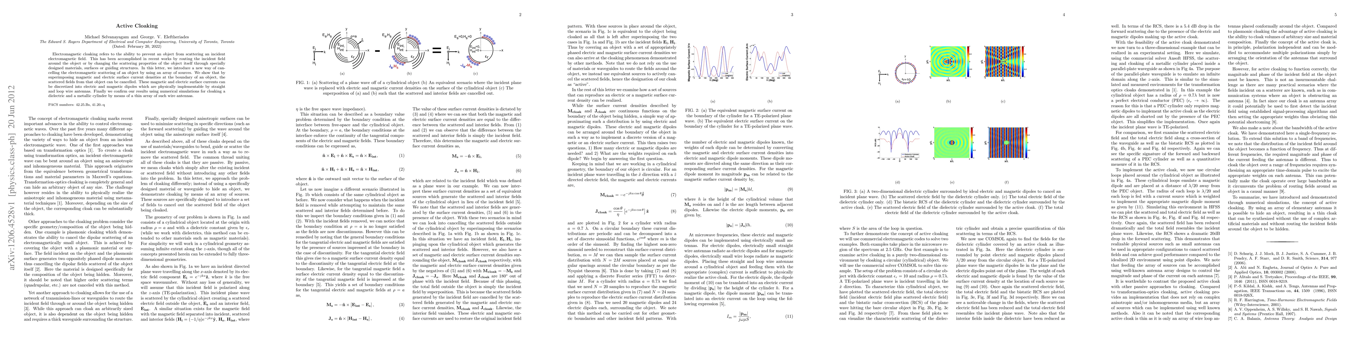 Electromagnetic cloaking refers to the ability to prevent an object from scattering an incident electromagnetic field. This has been accomplished in recent works by routing the incident field around the object or by changing the scattering properties of the object itself through specially designed materials, surfaces or guiding structures. In this letter, we introduce a new way of cancelling the electromagnetic scattering of an object by using an array of sources. We show that by superimposing magnetic and electric surface current densities at the boundary of an object, the scattered fields from that object can be cancelled. These magnetic and electric surface currents can be discretized into electric and magnetic dipoles which are physically implementable by straight and loop wire antennas. Finally we confirm our results using numerical simulations for cloaking a dielectric and a metallic cylinder by means of a thin array of such wire antennas.