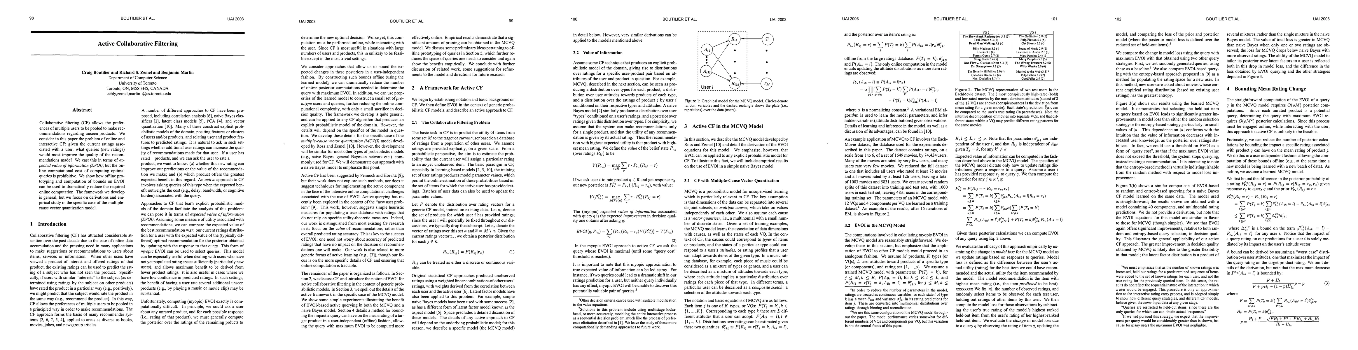 Collaborative filtering (CF) allows the preferences of multiple users to be pooled to make recommendations regarding unseen products. We consider in this paper the problem of online and interactive CF: given the current ratings associated with a user, what queries (new ratings) would most improve the quality of the recommendations made? We cast this terms of expected value of information (EVOI); but the online computational cost of computing optimal queries is prohibitive. We show how offline prototyping and computation of bounds on EVOI can be used to dramatically reduce the required online computation. The framework we develop is general, but we focus on derivations and empirical study in the specific case of the multiple-cause vector quantization model.