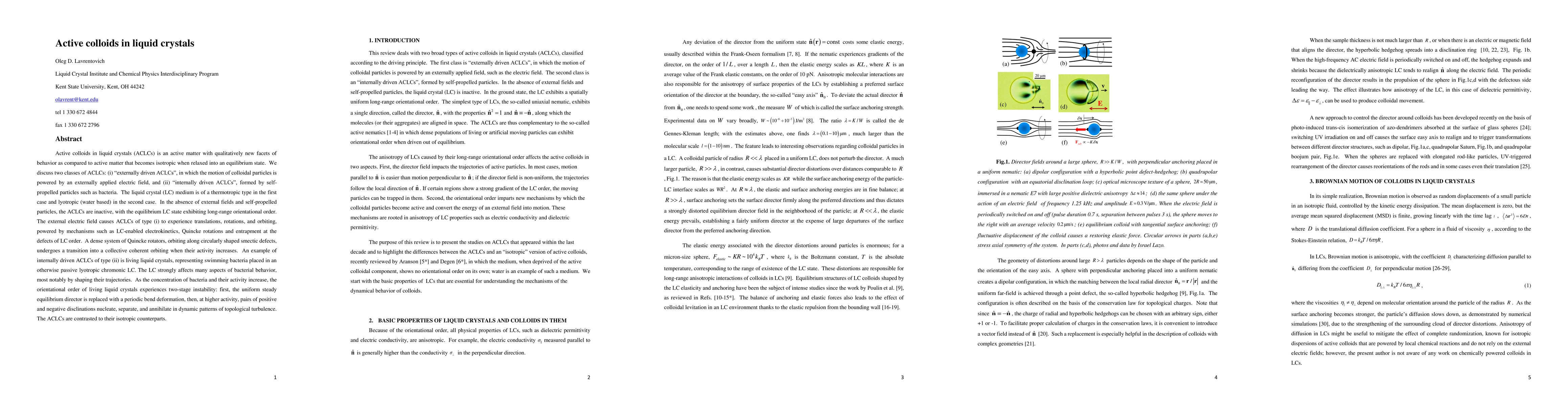 This paper explores active colloids in liquid crystals (ACLCs), focusing on two classes: externally driven colloids powered by electric fields and internally driven self-propelled particles like bacteria. The study reveals unique behaviors in liquid crystal environments, including collective coherent orbiting and topological turbulence in bacterial systems.