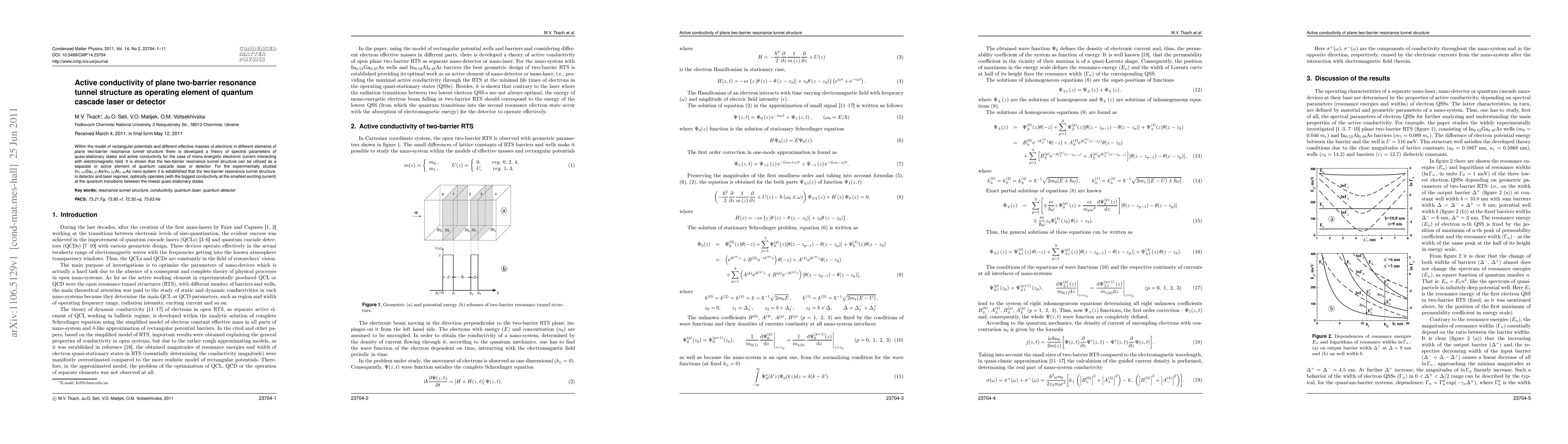 This paper develops a theory for the active conductivity of a plane two-barrier resonance tunnel structure, showing its potential use in quantum cascade lasers or detectors. The two-barrier structure optimally operates at the smallest exciting current during quantum transitions between the lowest quasi-stationary states.