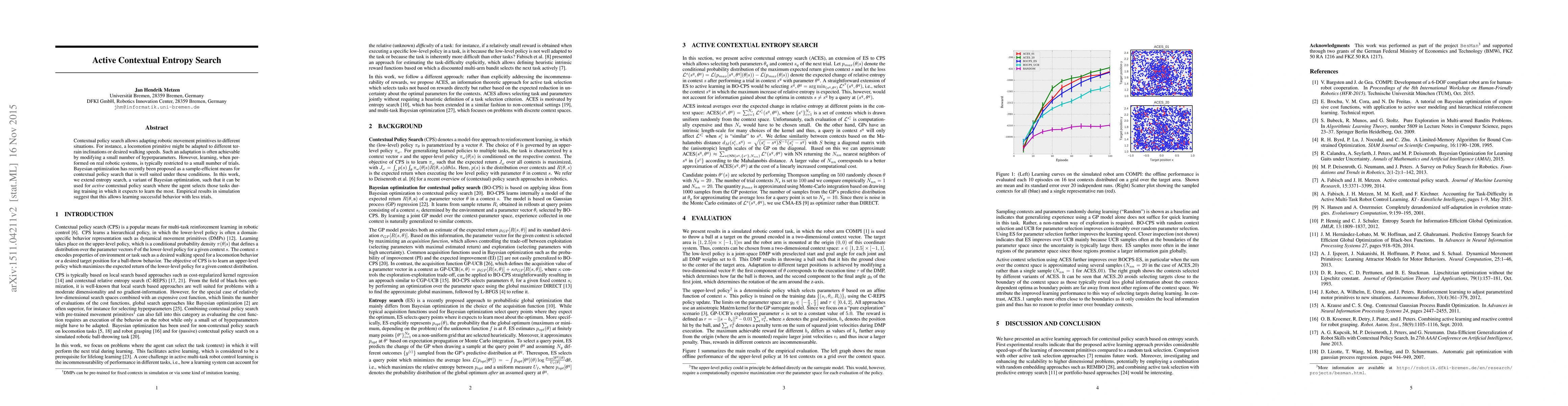 Contextual policy search allows adapting robotic movement primitives to different situations. For instance, a locomotion primitive might be adapted to different terrain inclinations or desired walking speeds. Such an adaptation is often achievable by modifying a small number of hyperparameters. However, learning, when performed on real robotic systems, is typically restricted to a small number of trials. Bayesian optimization has recently been proposed as a sample-efficient means for contextual policy search that is well suited under these conditions. In this work, we extend entropy search, a variant of Bayesian optimization, such that it can be used for active contextual policy search where the agent selects those tasks during training in which it expects to learn the most. Empirical results in simulation suggest that this allows learning successful behavior with less trials.
