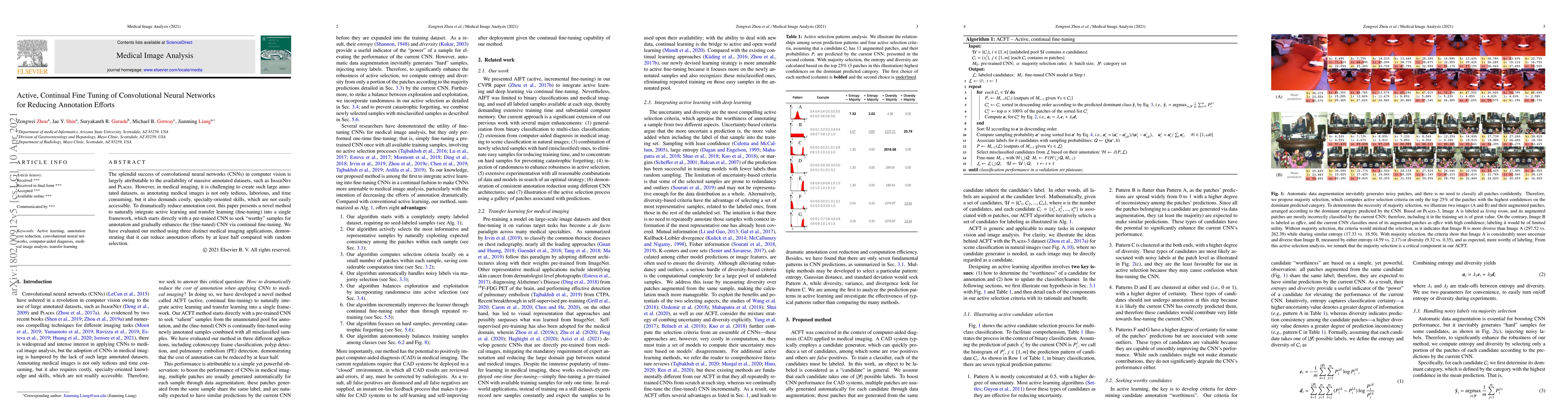 This research introduces a method combining active learning and transfer learning to reduce the annotation effort needed for training convolutional neural networks in medical imaging. By starting with a pre-trained CNN and iteratively selecting "worthy" samples for annotation, the approach significantly cuts down on the laborious and costly process of annotating medical images, as demonstrated through three medical imaging applications.
