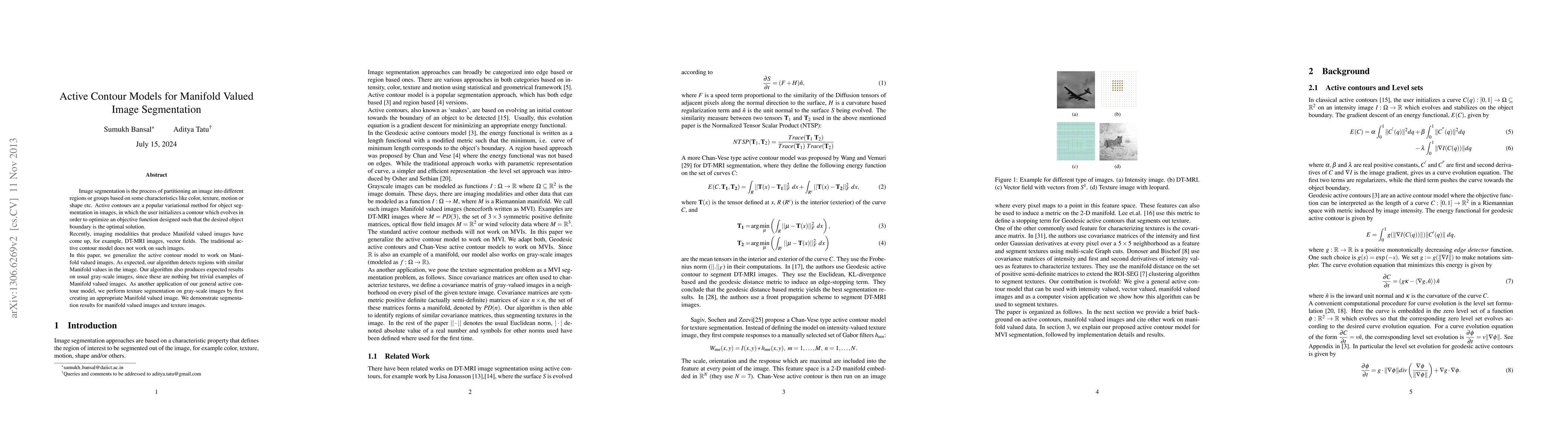 This paper generalizes the active contour model to segment Manifold valued images, such as DT-MRI and vector fields, by optimizing an objective function. The proposed method also effectively segments grayscale images and demonstrates texture segmentation by converting them into Manifold valued images.