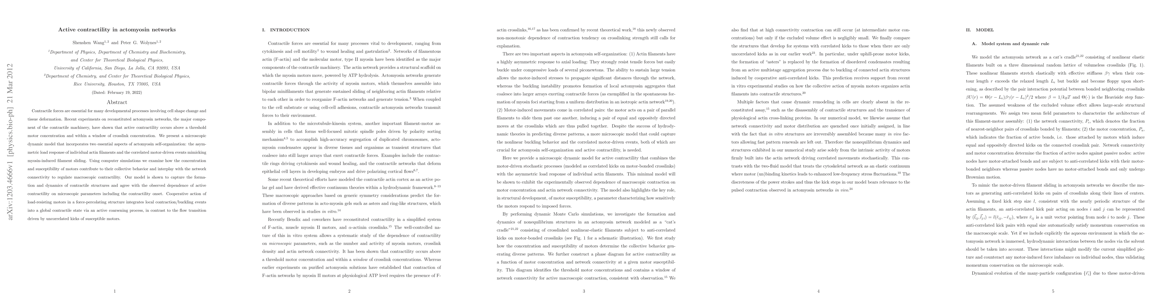 The research explores active contractility in actomyosin networks through a microscopic dynamic model that captures the collective behavior of motors and their interaction with network connectivity, explaining the onset and dynamics of contractile structures. The study highlights the cooperative role of load-resisting motors in achieving a global contractile state via active coarsening.