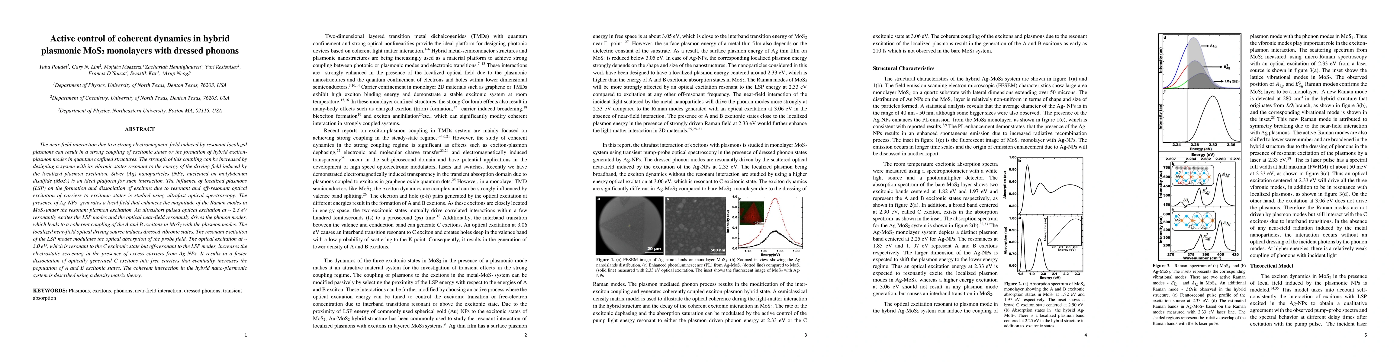 The near-field interaction due to a strong electromagnetic field induced by resonant localized plasmons can result in a strong coupling of excitonic states or formation of hybrid exciton-plasmon modes in quantum confined structures. This coupling can be strengthed by designing a system with its vibronic states resonant to the energy of the driving field induced by the localized plasmon excitation. Silver nanoislands nucleated on molybdenum disulfide (MoS2) is an ideal platform for such interaction. The influence of localized plasmons (LSP) on the formation and dissociation of excitons due to resonant and off-resonant optical excitation of carriers to excitonic states is studied using ultrafast optical spectroscopy. The local field due to the Ag nanoparticles (Ag-NP) enhances the magnitude of the Raman modes in MoS2 in the presence of resonant excitation. An ultrashort pulsed optical excitation at 2.3 eV resonantly excites the LSP modes and the optical near-field resonantly drive the phonon modes, which leads to a coherent coupling of the A and B excitons in MoS2 with the plasmon modes. The resonant excitation of the LSP modes modulate the optical absorption of the probe field. The resonant excitation of C exciton due to an excitation source at 3.0 eV, which is off-resonant to the LSP mode increases the electrostatic screening in the presence of excess carriers from Ag NPs. It results in a faster dissociation of optically generated C excitons into free carriers that eventually increase the A and B exciton population. A 3-level density matrix theory in the presence of dressed vibronic states induced by a localized near-field optical driving source is applied to describe the coherent interaction process in the hybrid nano-plasmonic system.
