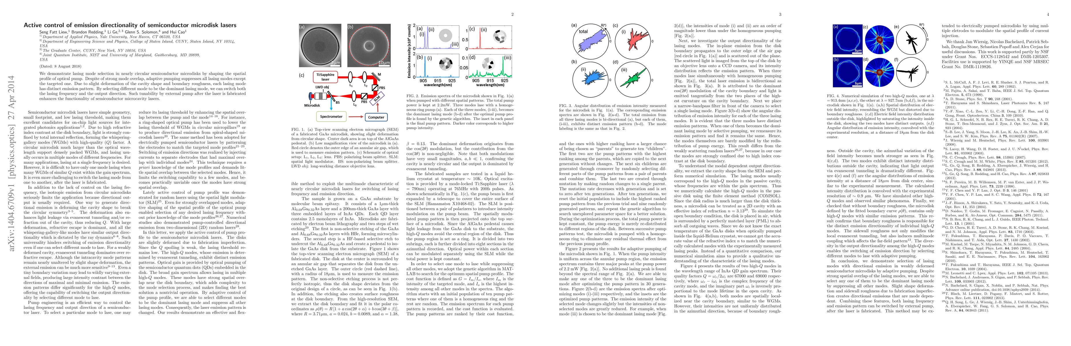 This paper demonstrates adaptive control of lasing mode and emission direction in semiconductor microdisk lasers by shaping the optical pump profile, enabling tunability of both frequency and output directionality post-fabrication. The technique leverages slight cavity deformations and boundary roughness to achieve distinct emission patterns for different modes.