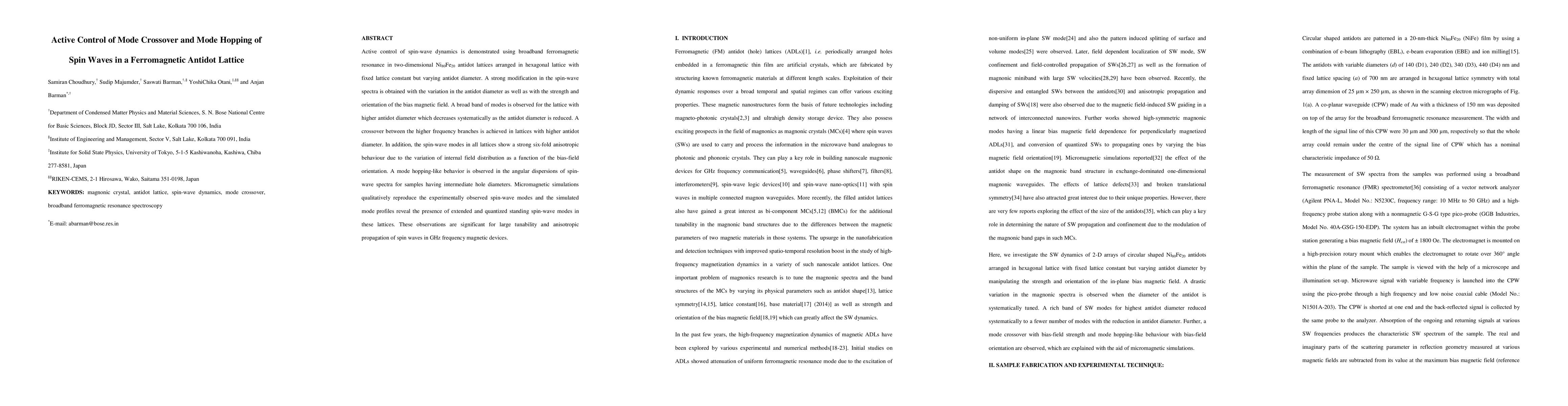 This paper demonstrates active control of spin-wave dynamics in ferromagnetic antidot lattices via ferromagnetic resonance, showing significant mode crossover and hopping behaviors influenced by antidot diameter and bias magnetic field. Micromagnetic simulations corroborate experimental findings, highlighting the potential for tunable GHz frequency magnetic devices.