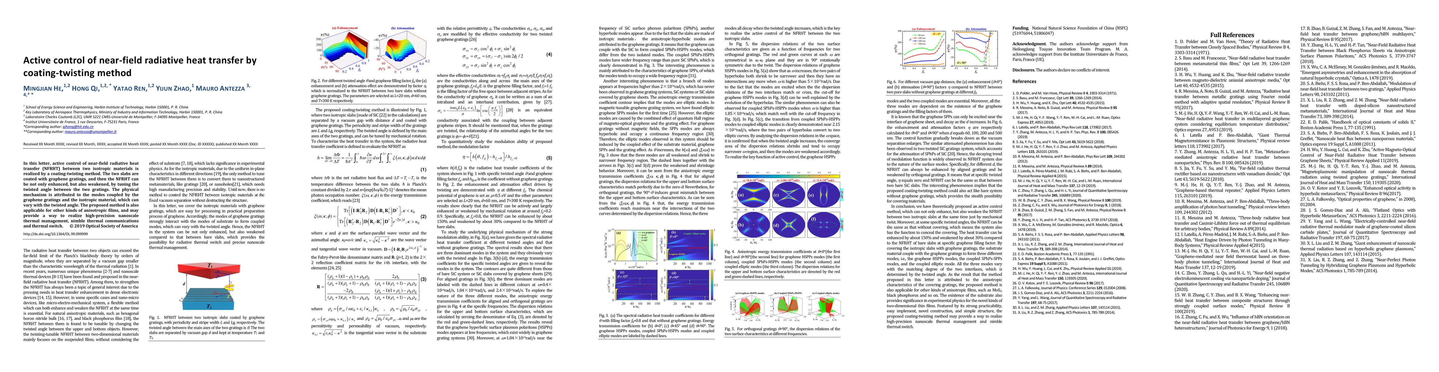 This research demonstrates active control of near-field radiative heat transfer (NFRHT) between two isotropic materials using a coating-twisting method with graphene gratings. The twisted angle of the gratings can enhance or weaken NFRHT, attributed to mode coupling variations, potentially enabling high-precision nanoscale thermal management and nimble thermal communications.