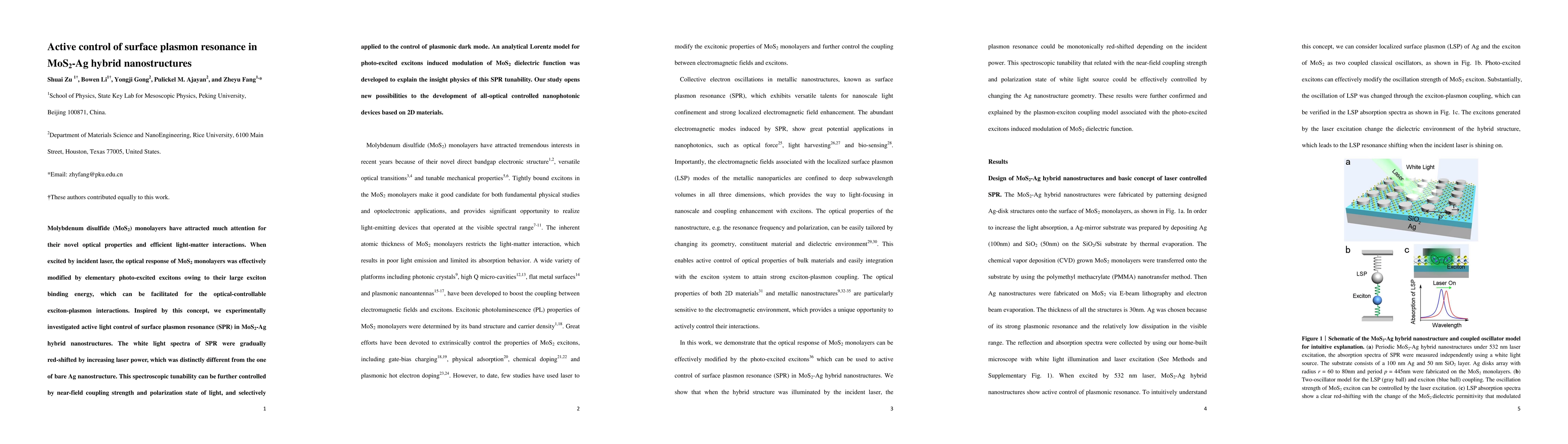 This paper investigates the active control of surface plasmon resonance in MoS2-Ag hybrid nanostructures, demonstrating that increasing laser power induces a red-shift in SPR spectra. The tunability is influenced by near-field coupling and light polarization, and an analytical model explains the exciton-plasmon interactions.
