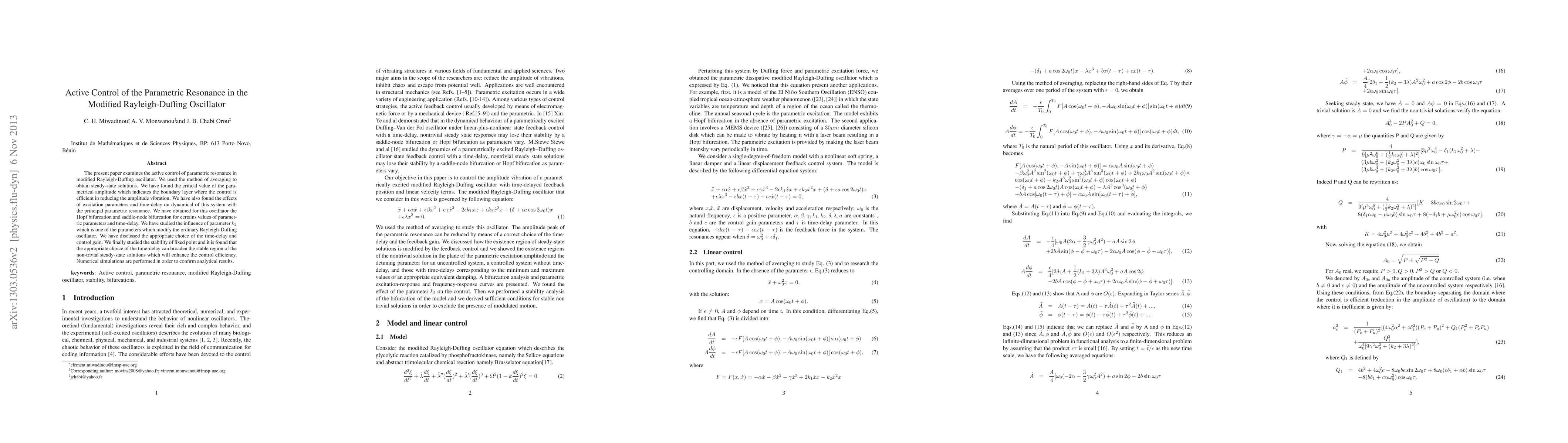 This paper investigates the active control of parametric resonance in a modified Rayleigh-Duffing oscillator using averaging methods. It identifies critical parametric amplitude values and examines the effects of excitation parameters and time-delay on system dynamics, revealing Hopf and saddle-node bifurcations, and discusses the stability and control efficiency enhancements through optimal time-delay selection.