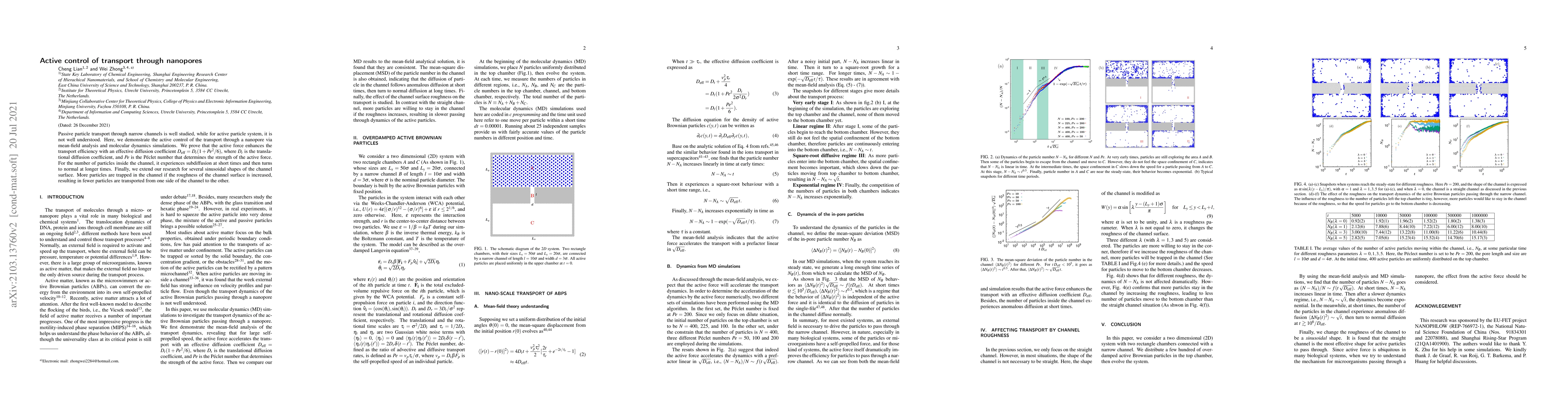 Researchers demonstrate active control of particle transport through nanopores using mean-field analysis and molecular dynamics simulations. They show that an active force can enhance transport efficiency with varying diffusion behavior based on the number of particles and channel surface roughness.