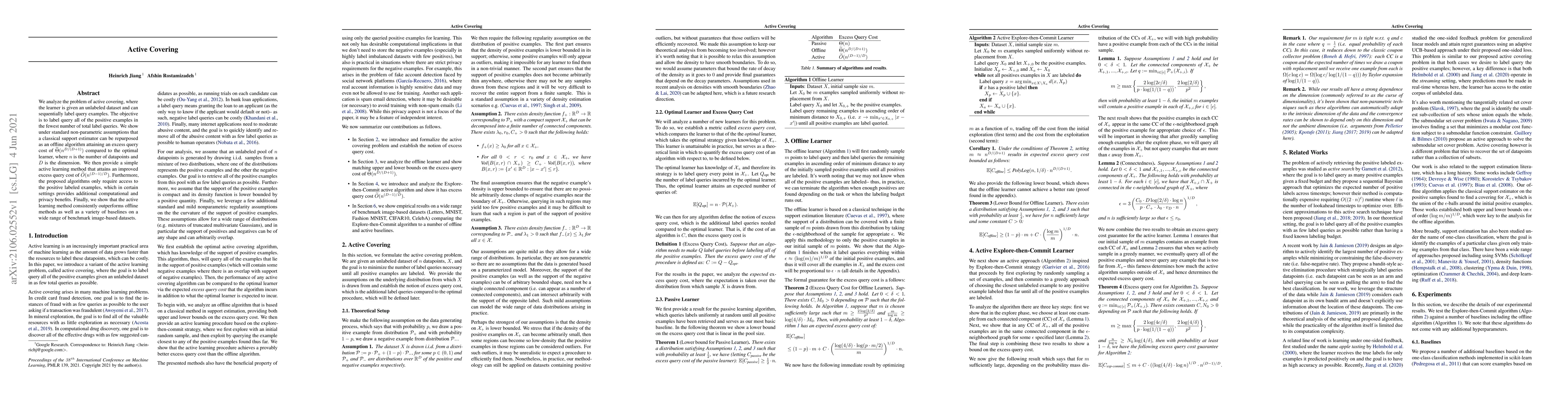 We analyze the problem of active covering, where the learner is given an unlabeled dataset and can sequentially label query examples. The objective is to label query all of the positive examples in the fewest number of total label queries. We show under standard non-parametric assumptions that a classical support estimator can be repurposed as an offline algorithm attaining an excess query cost of $\widetilde{\Theta}(n^{D/(D+1)})$ compared to the optimal learner, where $n$ is the number of datapoints and $D$ is the dimension. We then provide a simple active learning method that attains an improved excess query cost of $\widetilde{O}(n^{(D-1)/D})$. Furthermore, the proposed algorithms only require access to the positive labeled examples, which in certain settings provides additional computational and privacy benefits. Finally, we show that the active learning method consistently outperforms offline methods as well as a variety of baselines on a wide range of benchmark image-based datasets.