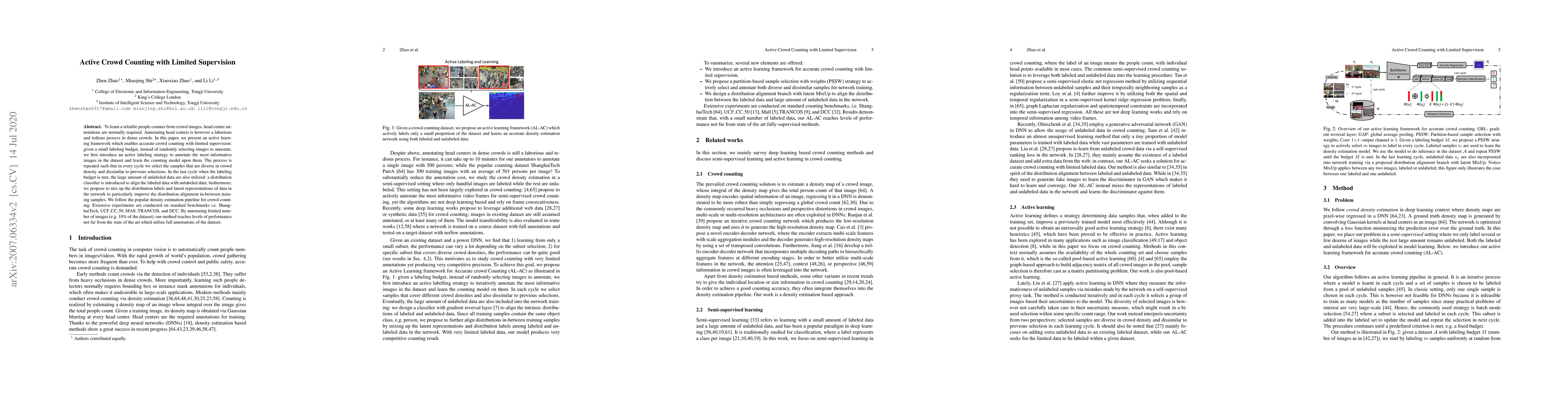 The paper presents an active learning framework for accurate crowd counting with limited supervision. It introduces a partition-based sample selection with weights (PSSW) and distribution alignment with latent MixUp, utilizing a limited labeling budget to achieve performance close to state-of-the-art methods.