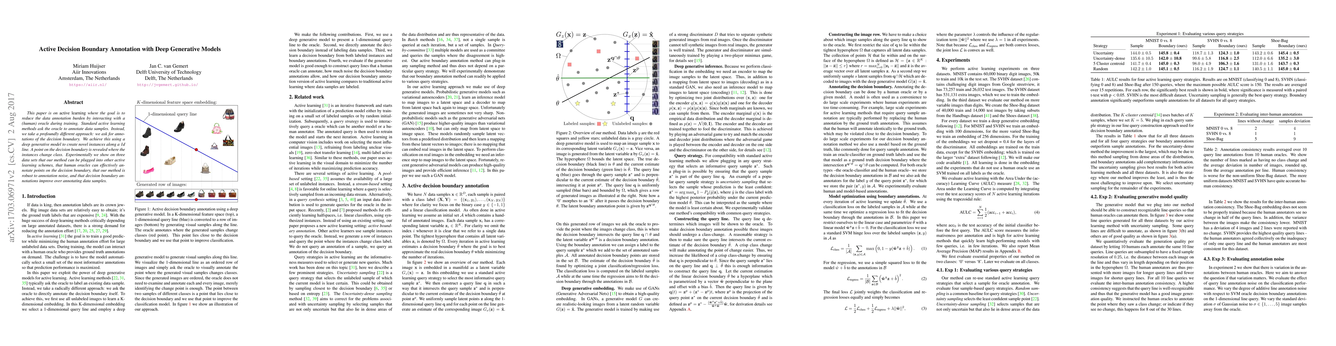 This paper proposes an active learning method that reduces annotation burden by having human oracles annotate decision boundary points instead of individual data samples, using a deep generative model to create instances along a line. Experimental results show improved performance over traditional methods.
