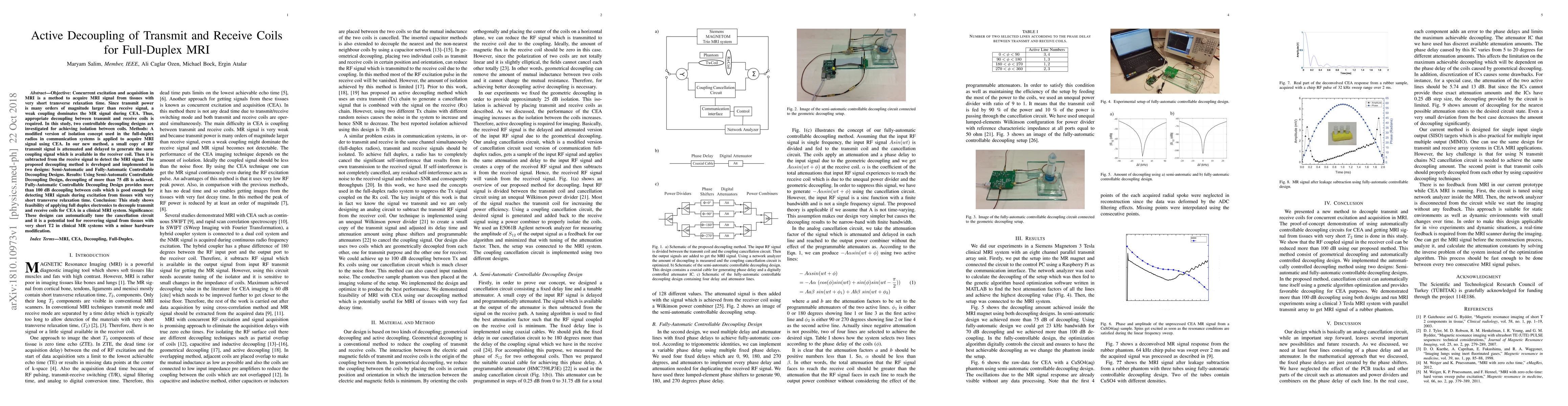 Researchers developed two decoupling designs to separate transmit and receive coils in MRI, achieving over 100 dB decoupling and enabling the detection of signals from tissues with short transverse relaxation times.
