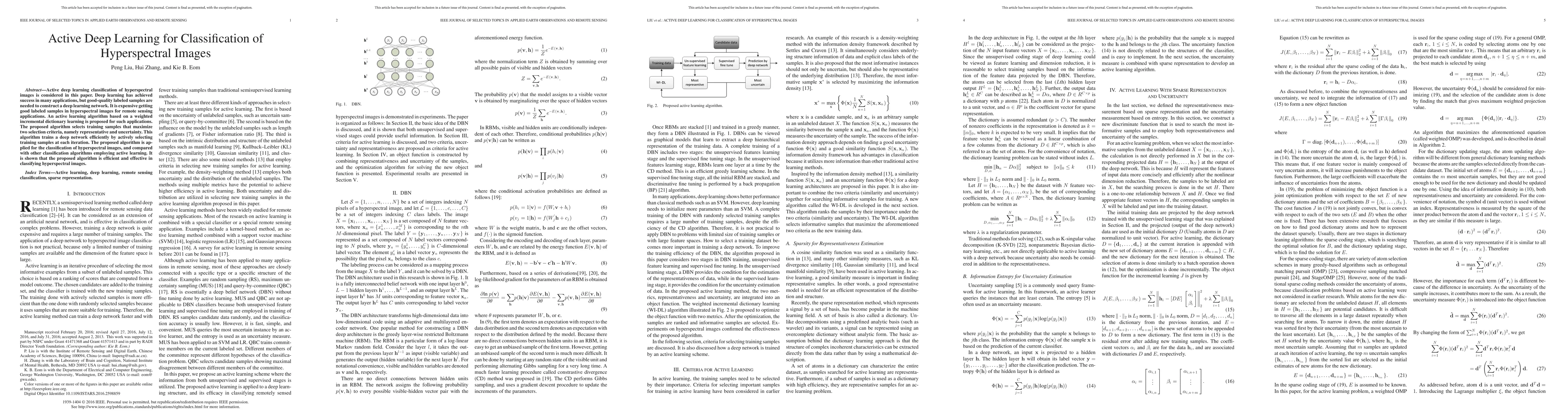 This paper proposes an active deep learning algorithm based on weighted incremental dictionary learning to classify hyperspectral images efficiently. The algorithm selects training samples that maximize representativeness and uncertainty, demonstrating improved performance compared to other active learning methods.