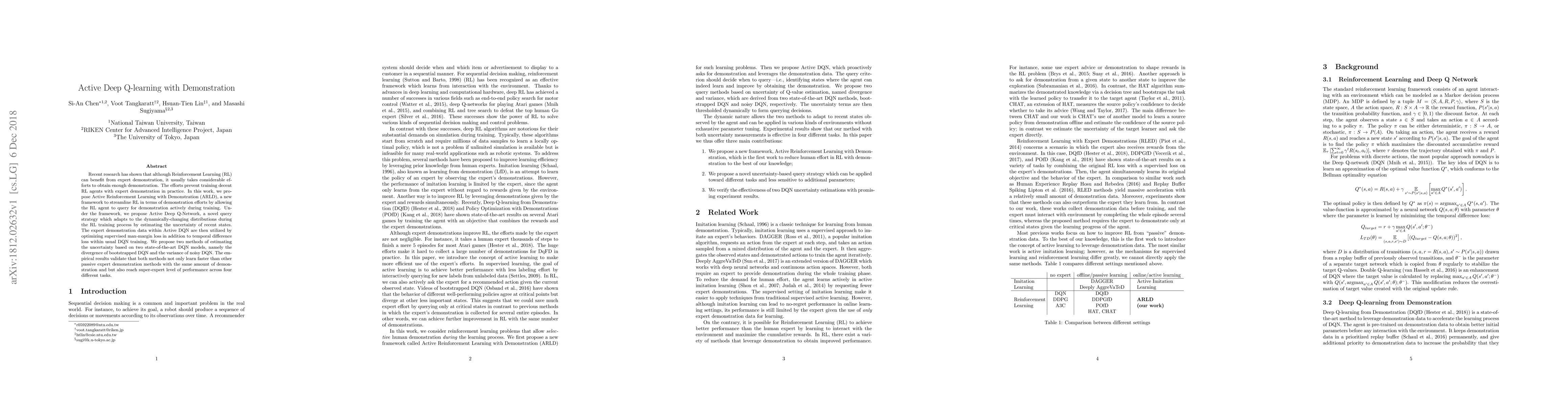 The paper introduces Active Reinforcement Learning with Demonstration (ARLD) to reduce efforts needed for expert demonstrations in Reinforcement Learning (RL). It proposes Active Deep Q-Network, a query strategy that actively seeks demonstrations by estimating uncertainty in state distributions. This method, validated across four tasks, learns faster and achieves super-expert performance compared to passive methods with similar demonstration data.