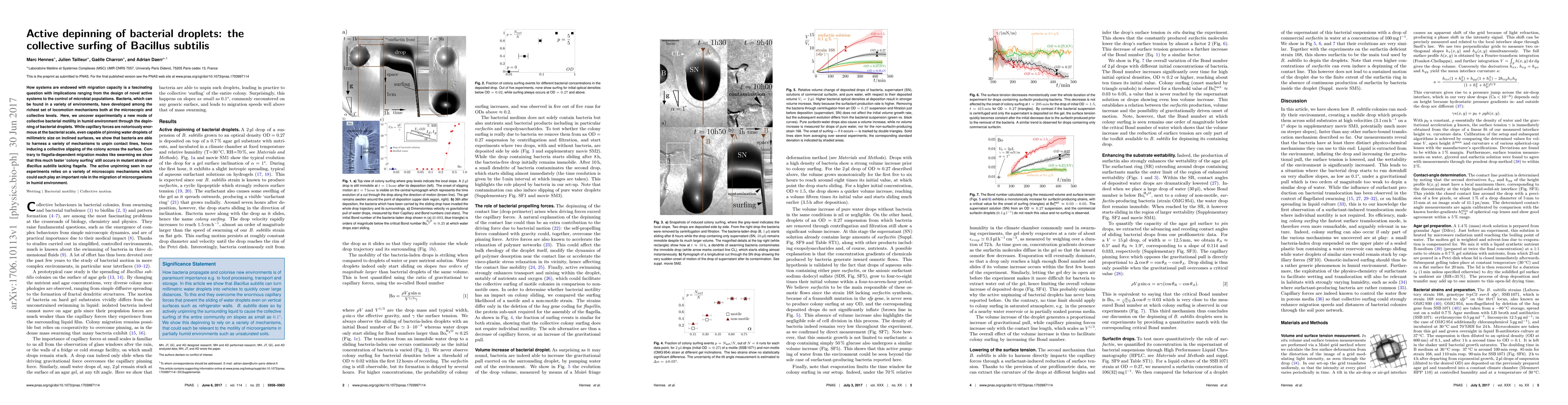 Researchers discovered a new mode of collective bacterial motility where Bacillus subtilis migrates across surfaces by harnessing microscopic mechanisms to unpin contact lines, even without flagella. This 'colony surfing' is faster than traditional swarming and has implications for designing novel active systems and controlling microbial populations.