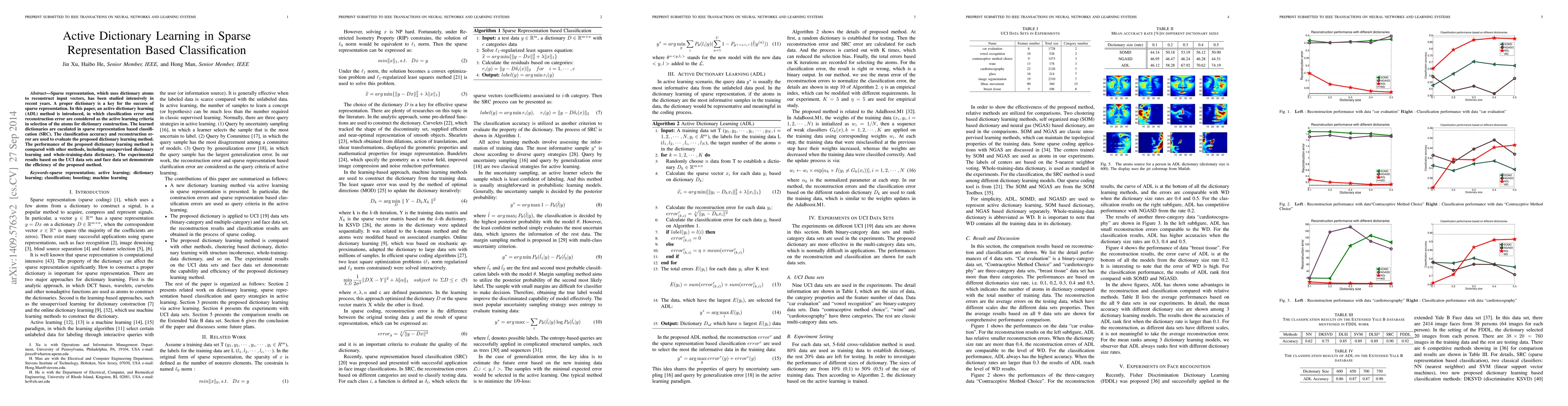 This paper introduces an active dictionary learning method for sparse representation-based classification, using classification and reconstruction errors as active learning criteria to select dictionary atoms. Experimental results on UCI and face datasets show improved performance compared to unsupervised dictionary learning and whole-training-data dictionary methods.