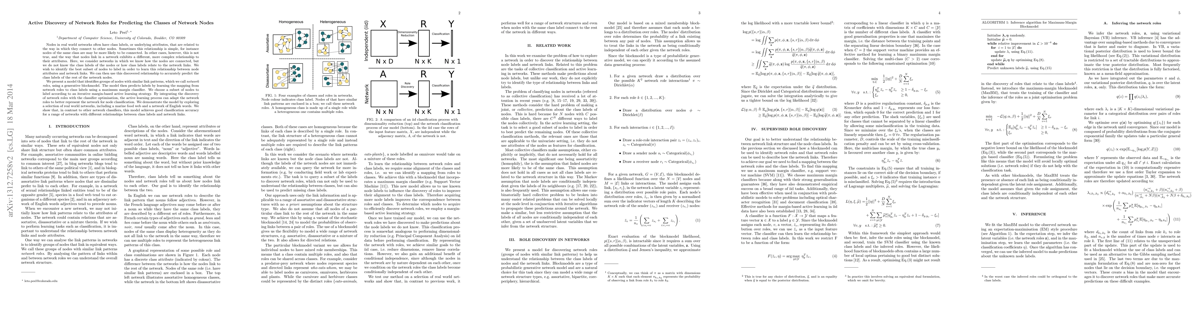 Nodes in real world networks often have class labels, or underlying attributes, that are related to the way in which they connect to other nodes. Sometimes this relationship is simple, for instance nodes of the same class are may be more likely to be connected. In other cases, however, this is not true, and the way that nodes link in a network exhibits a different, more complex relationship to their attributes. Here, we consider networks in which we know how the nodes are connected, but we do not know the class labels of the nodes or how class labels relate to the network links. We wish to identify the best subset of nodes to label in order to learn this relationship between node attributes and network links. We can then use this discovered relationship to accurately predict the class labels of the rest of the network nodes. We present a model that identifies groups of nodes with similar link patterns, which we call network roles, using a generative blockmodel. The model then predicts labels by learning the mapping from network roles to class labels using a maximum margin classifier. We choose a subset of nodes to label according to an iterative margin-based active learning strategy. By integrating the discovery of network roles with the classifier optimisation, the active learning process can adapt the network roles to better represent the network for node classification. We demonstrate the model by exploring a selection of real world networks, including a marine food web and a network of English words. We show that, in contrast to other network classifiers, this model achieves good classification accuracy for a range of networks with different relationships between class labels and network links.