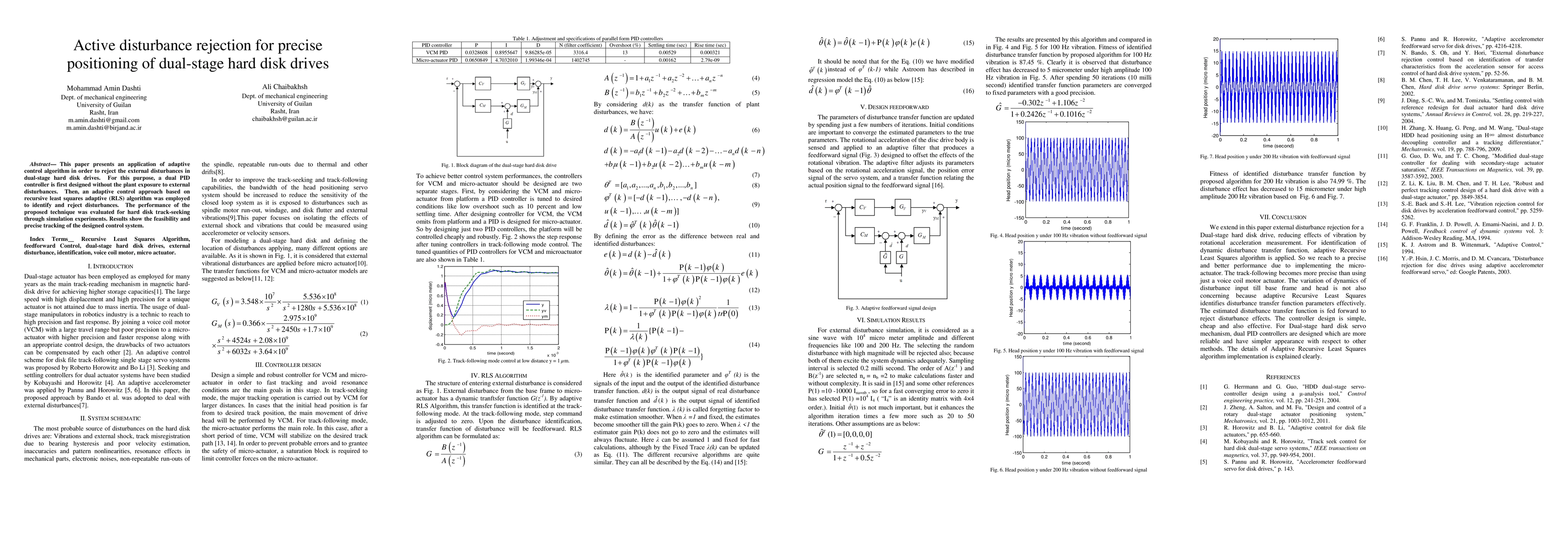 This paper applies an adaptive control algorithm to precisely position dual-stage hard disk drives by using a dual PID controller and an RLS-based adaptive control approach to reject external disturbances, demonstrating effective tracking through simulation.
