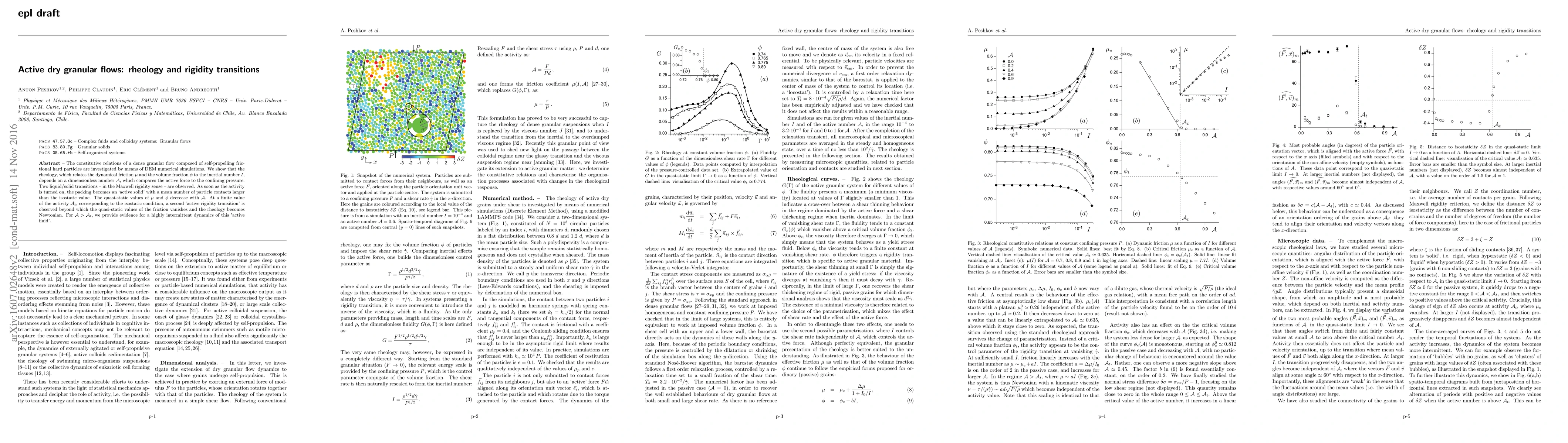 Researchers studied dense granular flows composed of self-propelling frictional hard particles using DEM simulations. They found two transitions: an 'active solid' phase with increased particle contacts beyond the isostatic value, followed by a Newtonian rheology transition at a critical activity threshold.