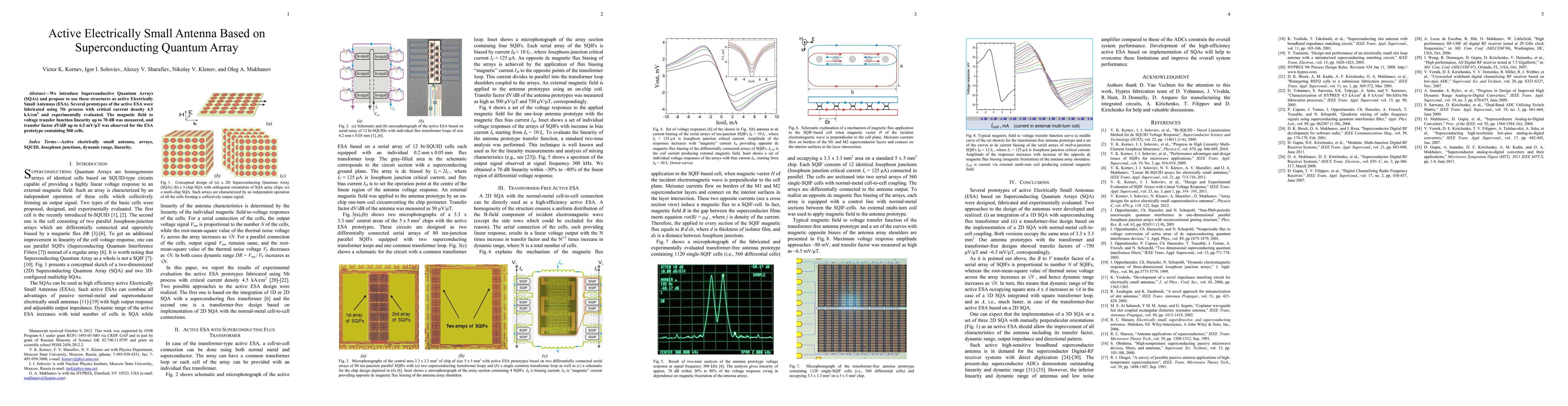 We introduce Superconductive Quantum Arrays (SQAs) and propose to use these structures as active Electrically Small Antennas (ESA). Several prototypes of the active ESA were fabricated using Nb process with critical current density 4.5 kA/cm2 and experimentally evaluated. The magnetic field to voltage transfer function linearity up to 70 dB was measured, and transfer factor dV/dB up to 6.5 mV/{\mu}T was observed for the ESA prototype containing 560 cells.