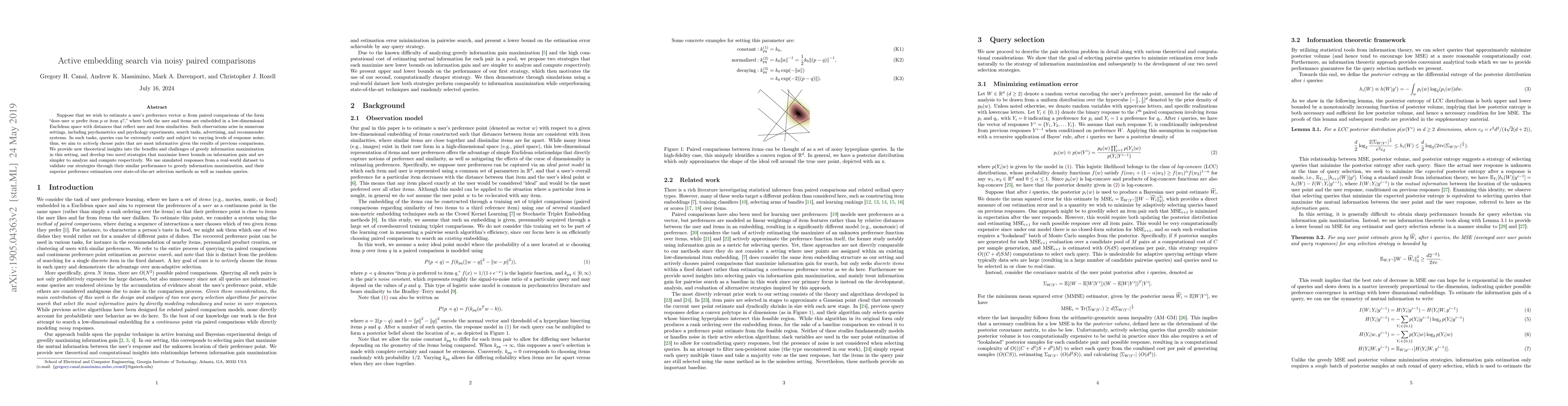 Suppose that we wish to estimate a user's preference vector $w$ from paired comparisons of the form "does user $w$ prefer item $p$ or item $q$?," where both the user and items are embedded in a low-dimensional Euclidean space with distances that reflect user and item similarities. Such observations arise in numerous settings, including psychometrics and psychology experiments, search tasks, advertising, and recommender systems. In such tasks, queries can be extremely costly and subject to varying levels of response noise; thus, we aim to actively choose pairs that are most informative given the results of previous comparisons. We provide new theoretical insights into the benefits and challenges of greedy information maximization in this setting, and develop two novel strategies that maximize lower bounds on information gain and are simpler to analyze and compute respectively. We use simulated responses from a real-world dataset to validate our strategies through their similar performance to greedy information maximization, and their superior preference estimation over state-of-the-art selection methods as well as random queries.