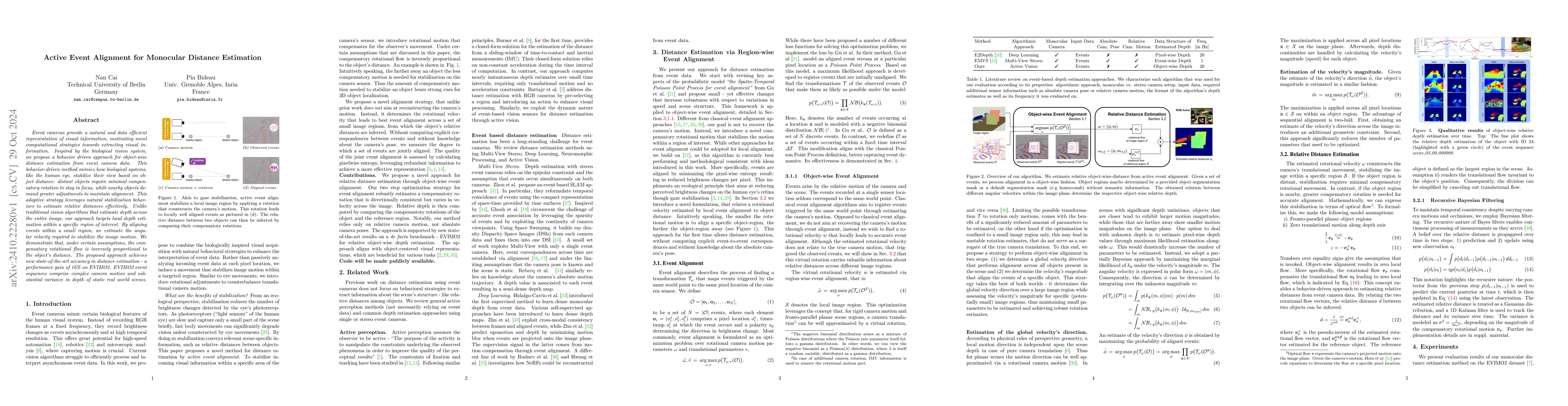 Event cameras provide a natural and data efficient representation of visual information, motivating novel computational strategies towards extracting visual information. Inspired by the biological vision system, we propose a behavior driven approach for object-wise distance estimation from event camera data. This behavior-driven method mimics how biological systems, like the human eye, stabilize their view based on object distance: distant objects require minimal compensatory rotation to stay in focus, while nearby objects demand greater adjustments to maintain alignment. This adaptive strategy leverages natural stabilization behaviors to estimate relative distances effectively. Unlike traditional vision algorithms that estimate depth across the entire image, our approach targets local depth estimation within a specific region of interest. By aligning events within a small region, we estimate the angular velocity required to stabilize the image motion. We demonstrate that, under certain assumptions, the compensatory rotational flow is inversely proportional to the object's distance. The proposed approach achieves new state-of-the-art accuracy in distance estimation - a performance gain of 16% on EVIMO2. EVIMO2 event sequences comprise complex camera motion and substantial variance in depth of static real world scenes.