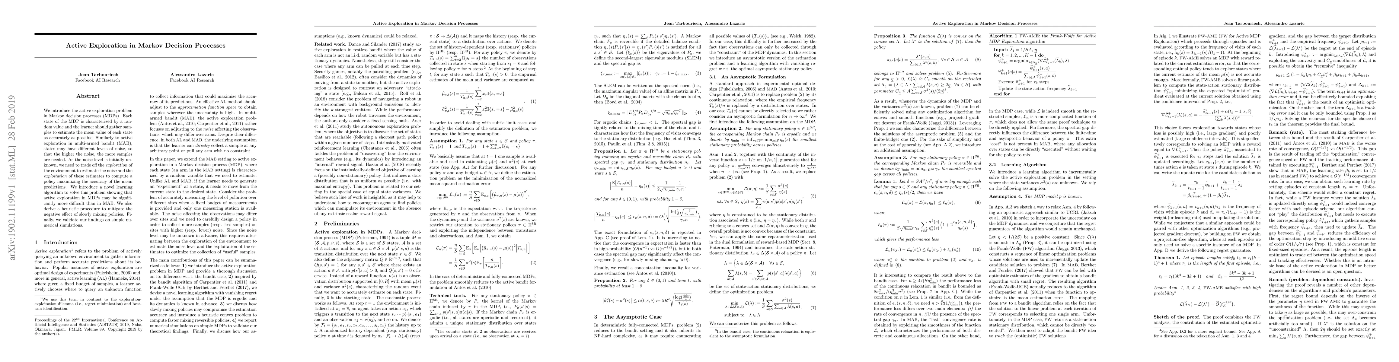 We introduce the active exploration problem in Markov decision processes (MDPs). Each state of the MDP is characterized by a random value and the learner should gather samples to estimate the mean value of each state as accurately as possible. Similarly to active exploration in multi-armed bandit (MAB), states may have different levels of noise, so that the higher the noise, the more samples are needed. As the noise level is initially unknown, we need to trade off the exploration of the environment to estimate the noise and the exploitation of these estimates to compute a policy maximizing the accuracy of the mean predictions. We introduce a novel learning algorithm to solve this problem showing that active exploration in MDPs may be significantly more difficult than in MAB. We also derive a heuristic procedure to mitigate the negative effect of slowly mixing policies. Finally, we validate our findings on simple numerical simulations.