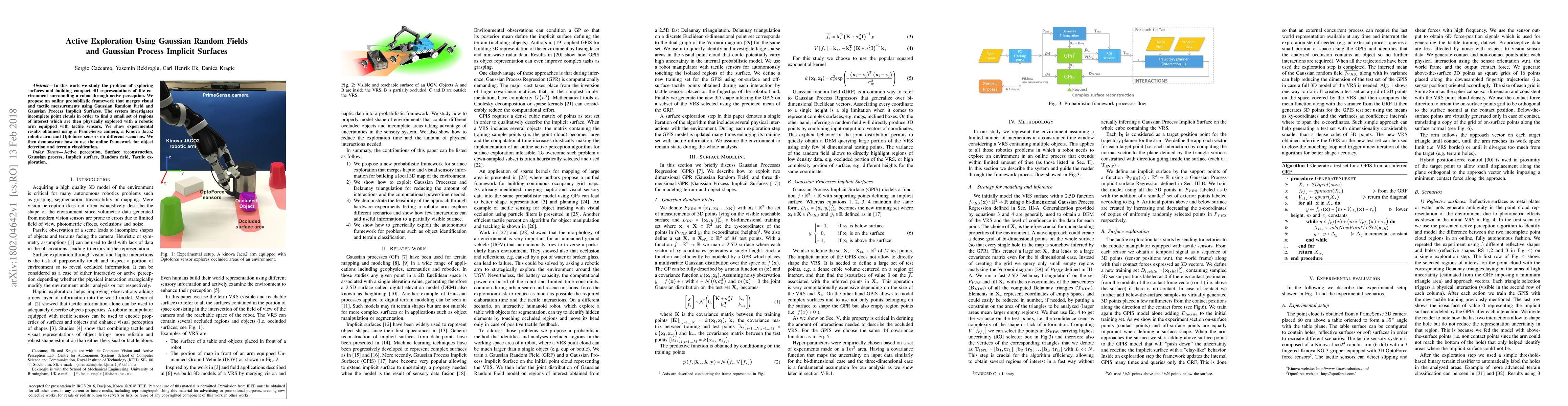 In this work we study the problem of exploring surfaces and building compact 3D representations of the environment surrounding a robot through active perception. We propose an online probabilistic framework that merges visual and tactile measurements using Gaussian Random Field and Gaussian Process Implicit Surfaces. The system investigates incomplete point clouds in order to find a small set of regions of interest which are then physically explored with a robotic arm equipped with tactile sensors. We show experimental results obtained using a PrimeSense camera, a Kinova Jaco2 robotic arm and Optoforce sensors on different scenarios. We then demonstrate how to use the online framework for object detection and terrain classification.