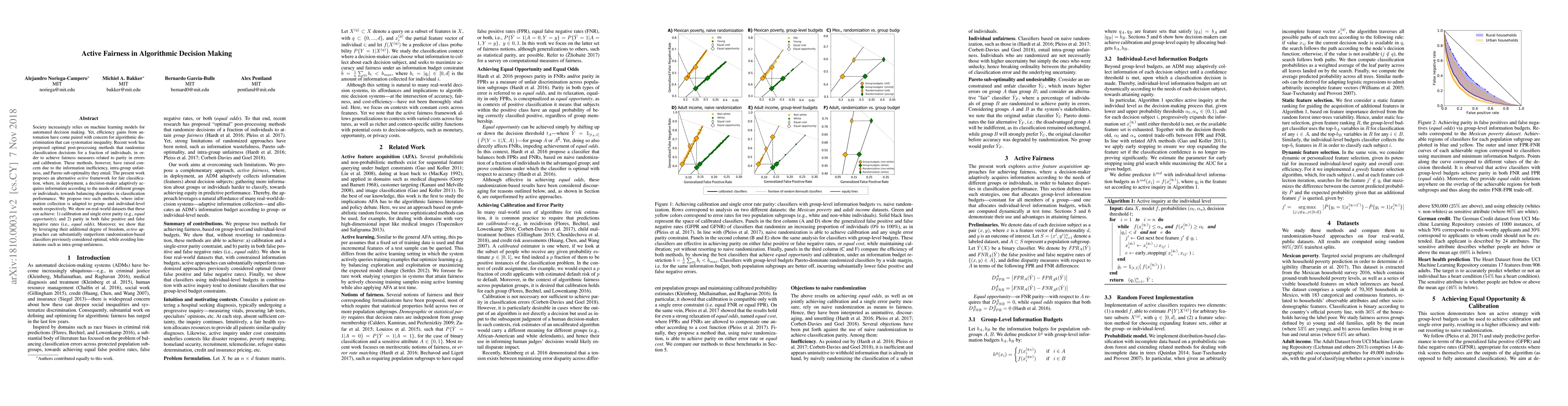 This paper proposes an active fairness framework for algorithmic decision-making that adaptively acquires information to balance disparities in classification performance, achieving calibration and parity in error rates. It demonstrates superior performance compared to randomization-based methods, while avoiding issues like intra-group unfairness.