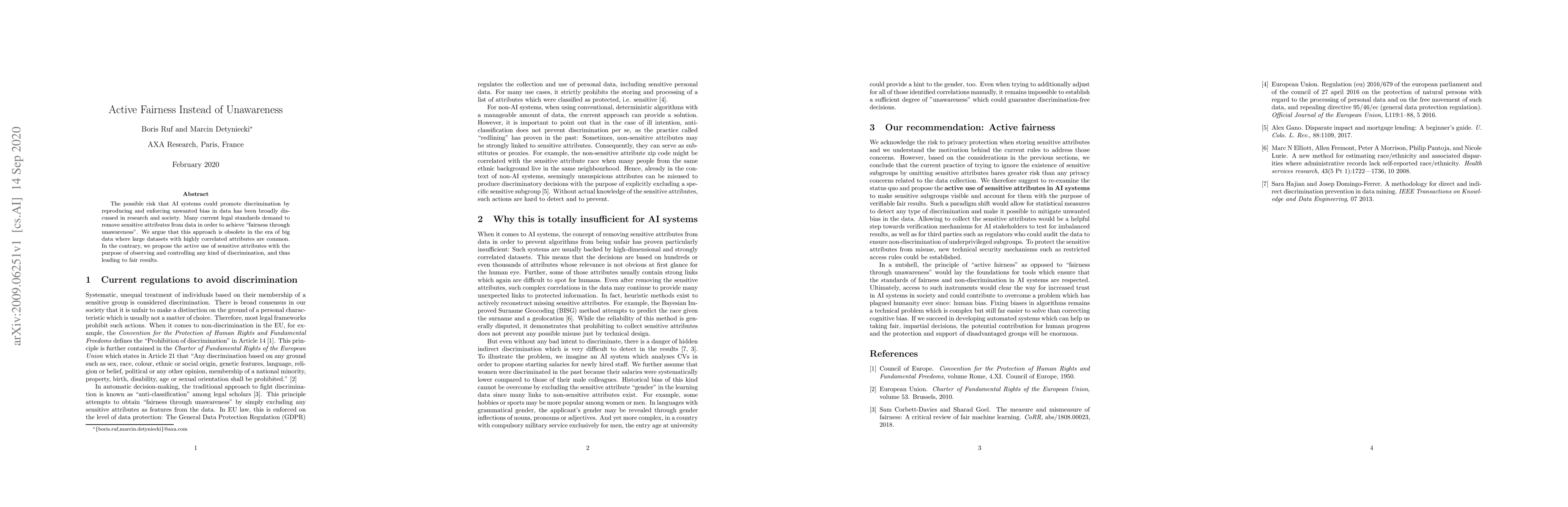 A new approach to fairness in AI systems proposes actively using sensitive attributes to observe and control discrimination, rather than removing them through unawareness. This method aims to achieve fair results in the era of big data with highly correlated attributes.