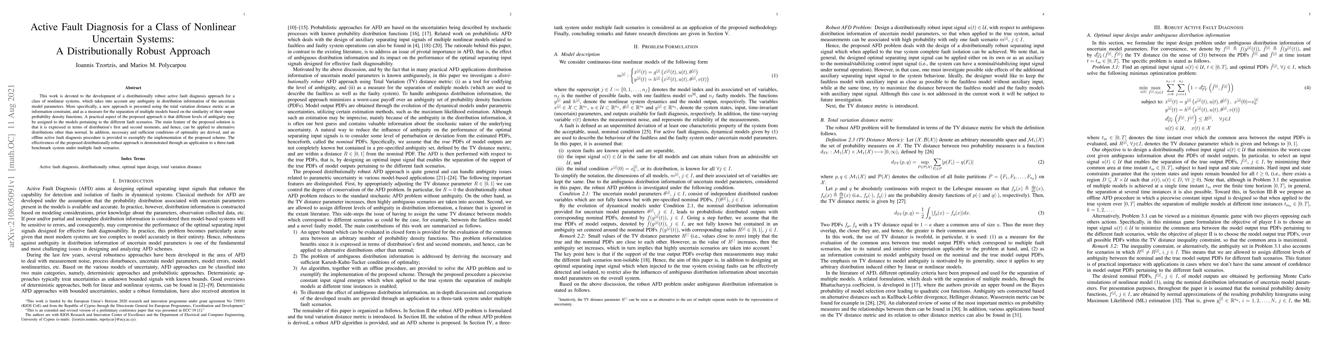 This paper proposes a distributionally robust active fault diagnosis method for nonlinear uncertain systems using total variation distance metrics, applicable to various distributions beyond normal. The approach allows for different ambiguity levels for fault scenarios and is demonstrated through a three-tank system.