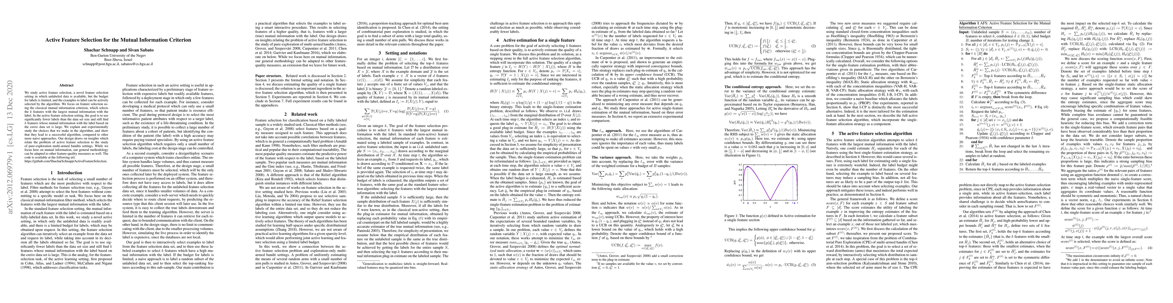 This paper proposes an active feature selection method that leverages unlabeled data to identify the most informative features with minimal labeled examples, using the mutual information criterion. The approach is shown to outperform naive methods and can be adapted for other feature-quality measures.