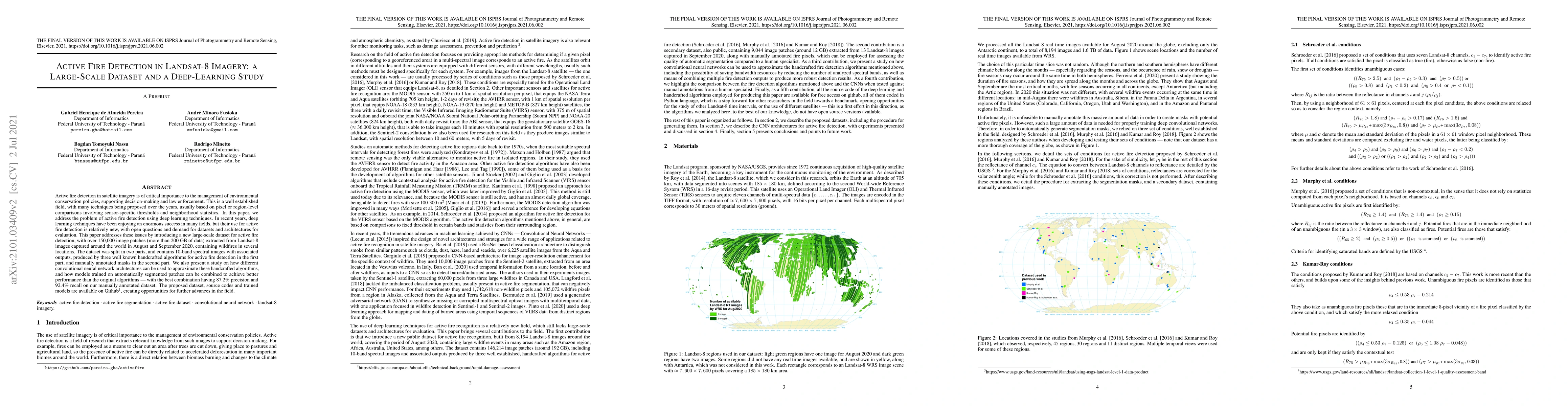 Active fire detection in satellite imagery is of critical importance to the management of environmental conservation policies, supporting decision-making and law enforcement. This is a well established field, with many techniques being proposed over the years, usually based on pixel or region-level comparisons involving sensor-specific thresholds and neighborhood statistics. In this paper, we address the problem of active fire detection using deep learning techniques. In recent years, deep learning techniques have been enjoying an enormous success in many fields, but their use for active fire detection is relatively new, with open questions and demand for datasets and architectures for evaluation. This paper addresses these issues by introducing a new large-scale dataset for active fire detection, with over 150,000 image patches (more than 200 GB of data) extracted from Landsat-8 images captured around the world in August and September 2020, containing wildfires in several locations. The dataset was split in two parts, and contains 10-band spectral images with associated outputs, produced by three well known handcrafted algorithms for active fire detection in the first part, and manually annotated masks in the second part. We also present a study on how different convolutional neural network architectures can be used to approximate these handcrafted algorithms, and how models trained on automatically segmented patches can be combined to achieve better performance than the original algorithms - with the best combination having 87.2% precision and 92.4% recall on our manually annotated dataset. The proposed dataset, source codes and trained models are available on Github (https://github.com/pereira-gha/activefire), creating opportunities for further advances in the field