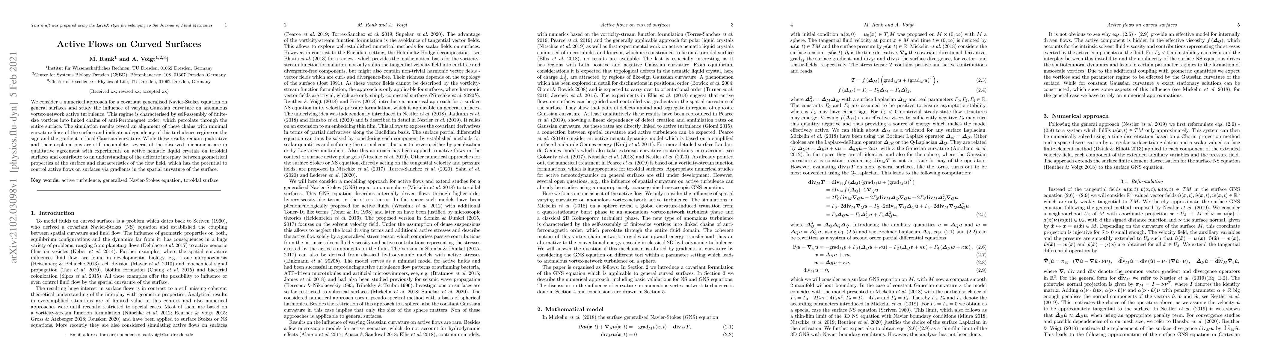 This paper explores a numerical method for solving a generalised Navier-Stokes equation on curved surfaces, revealing how varying Gaussian curvature influences the turbulence of active vortex networks. The study finds that vortex chains align with minimal curvature lines and depend on the sign and gradient of local Gaussian curvature, offering insights into controlling active flows on surfaces through curvature gradients.