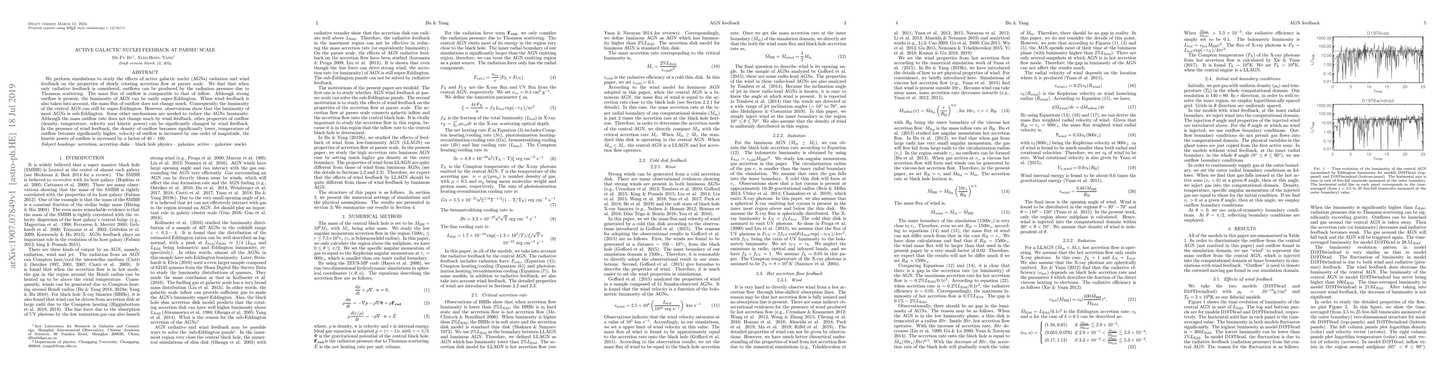 We perform simulations to study the effects of active galactic nuclei (AGNs) radiation and wind feedback on the properties of slowly rotating accretion flow at parsec scale. We find that when only radiative feedback is considered, outflows can be produced by the radiation pressure due to Thomson scattering. The mass flux of outflow is comparable to that of inflow. Although strong outflow is present, the luminosity of AGN can be easily super-Eddington. When wind feedback is also taken into account, the mass flux of outflow does not change much. Consequently, the luminosity of the central AGN can still be super-Eddington. However, observations show that the luminosity of most AGNs is sub-Eddington. Some other mechanisms are needed to reduce the AGNs luminosity. Although the mass outflow rate does not change much by wind feedback, other properties of outflow (density, temperature, velocity and kinetic power) can be significantly changed by wind feedback. In the presence of wind feedback, the density of outflow becomes significantly lower, temperature of outflow becomes significantly higher, velocity of outflow is increased by one order of magnitude, the kinetic power of outflow is increased by a factor of $40-100$.